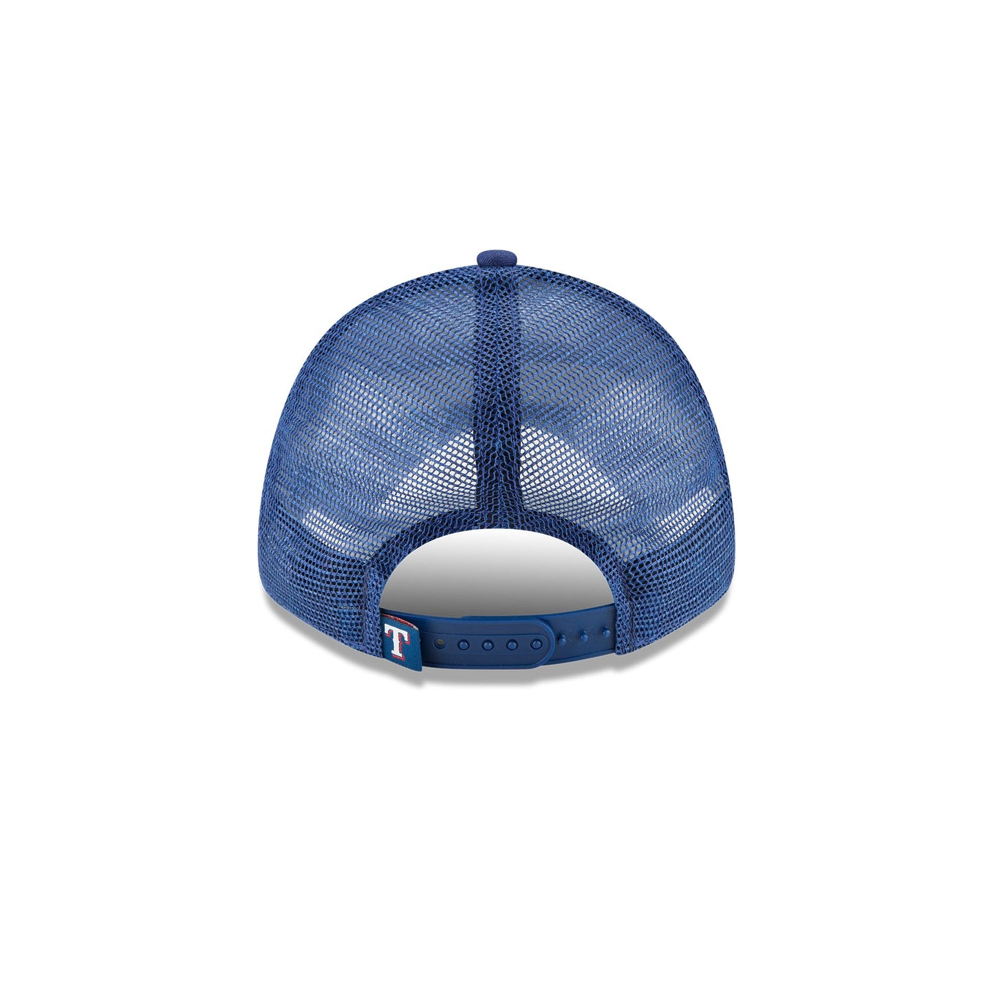 The Texas Rangers 9FORTY Trucker features an embroidered Rangers logo at the front panels with snapback closure at the rear.