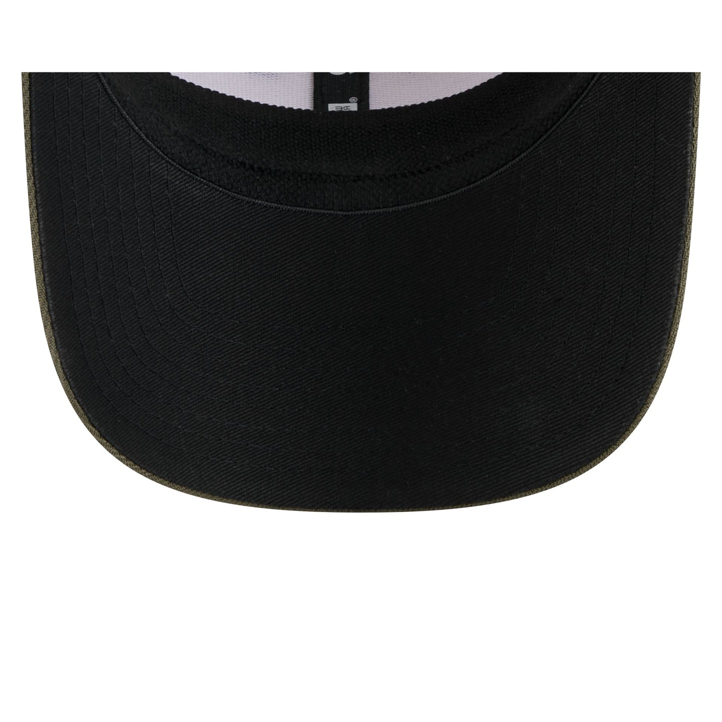 The Texas Rangers Armed Forces Day 2025 9SEVENTY Trucker features an embroidered Rangers logo at the front panels with the American Flag embroidered at the right-wear side. Additional details include an MLB Batterman logo above a stretch-snap mesh closure at the rear and a black undervisor.