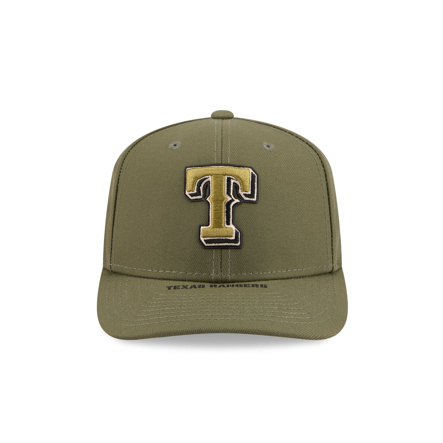 The Texas Rangers Armed Forces Day 2026 9SEVENTY Stretch-Snap Cap features an embroidered Rangers patch at the front panels with a matching MLB Batterman logo above a stretch-snap closure at the rear and a screen-printed team wordmark at the visor. Additional details include a heat sealed silicone USA flag patch at the right-wear side with screen-printed stars at a black undervisor and camo patterned interior panels.
