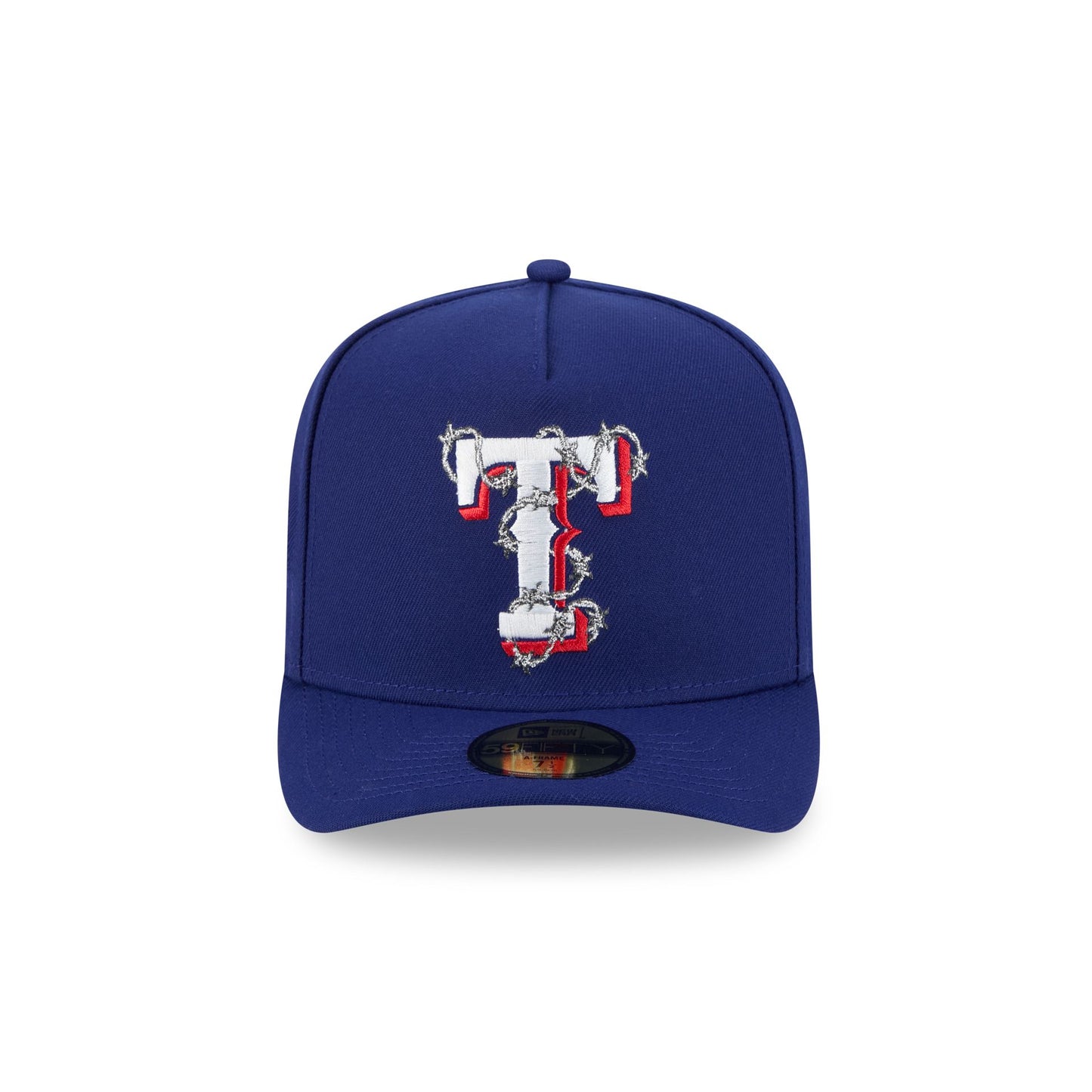 The Texas Rangers Barbed Wire 59FIFTY A-Frame Fitted Cap featured an embroidered barbed wire wrapped Rangers logo at the front panel with a matching MLB Batterman logo at the rear, a monochromatic team logo at the right-wear side, and a gray undervisor.