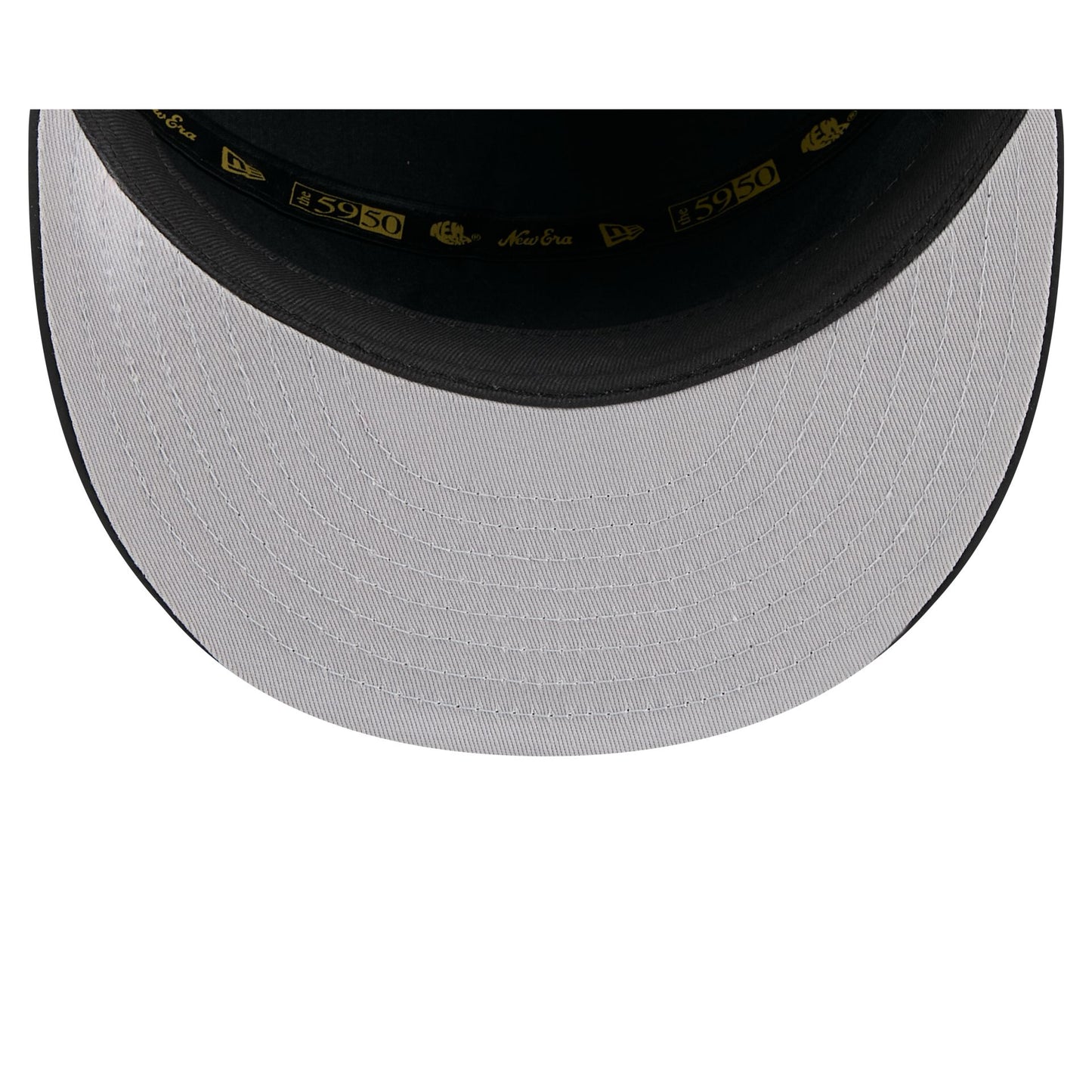 The Texas Rangers Black Poly Rope 59FIFTY Split Panel Fitted Cap features a woven Rangers logo at the front panels with a matching MLB Batterman embroidered at the rear. Additional details include a rope at the visor and a gray undervisor.