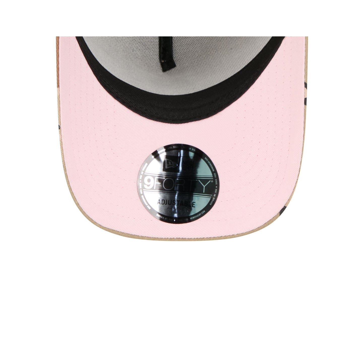 The Texas Rangers Camo Hearts 9FORTY A-Frame Snapback features an embroidered Rangers logo at the front panels against a camo and heart print pattern throughout. Additional details include an adjustable snapback closure at the rear and a pink undervisor.