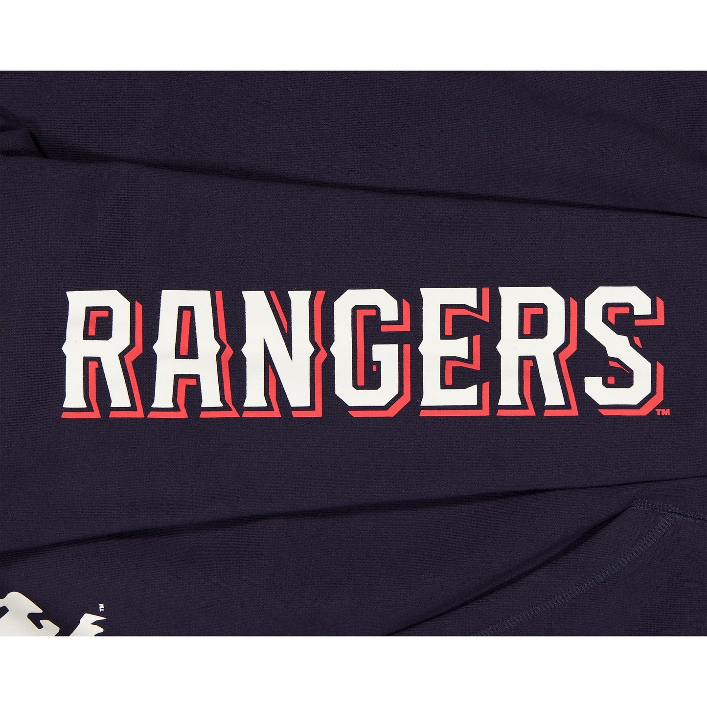Jersey inspired, city connected. The Texas Rangers City Connect Navy Hoodie features a screen-printed Rangers logo at the front with a team wordmark at the left-wear sleeve.