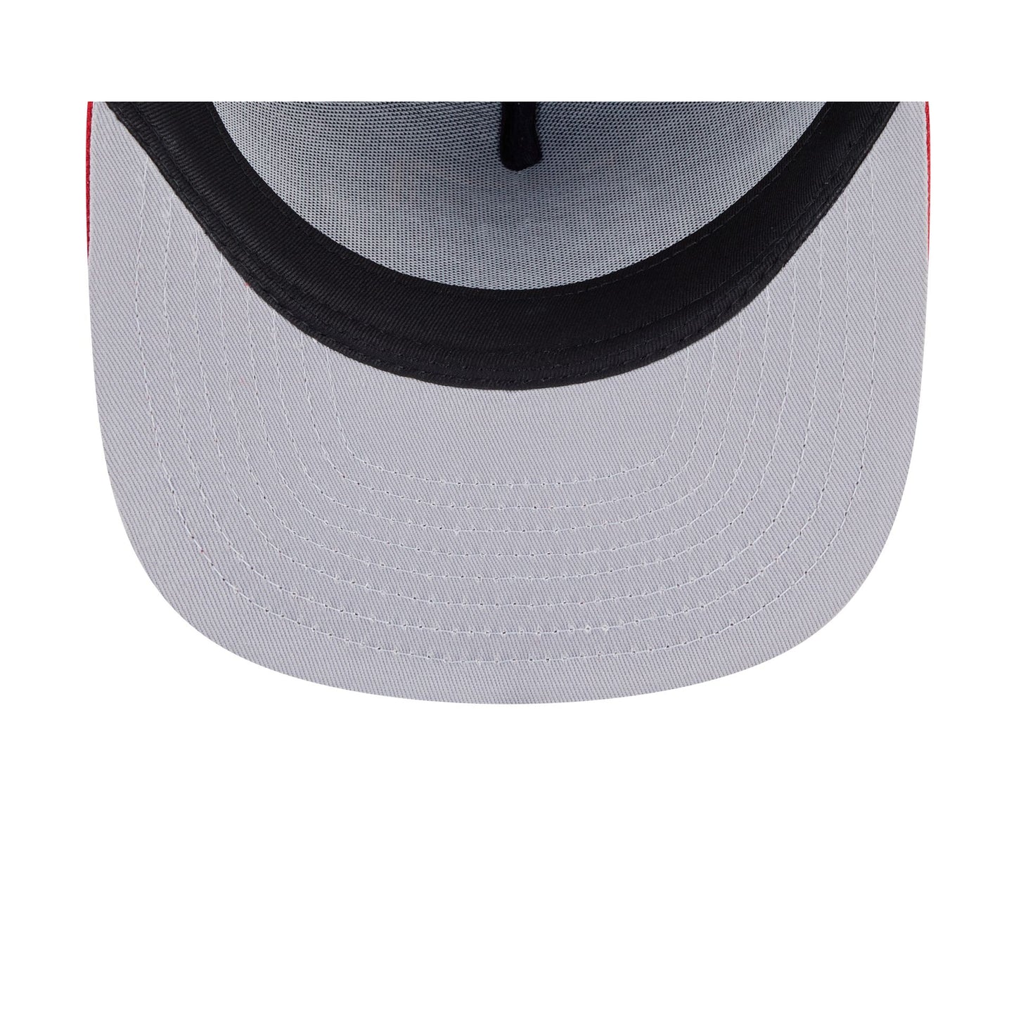 The Texas Rangers City Script 9FIFTY A-Frame Snapback features an embroidered Rangers logo with a layered team script on top at the front panel and an adjustable snapback closure at the rear. Additional details include the Mexican flag at the right-wear side with a red visor and a gray undervisor.