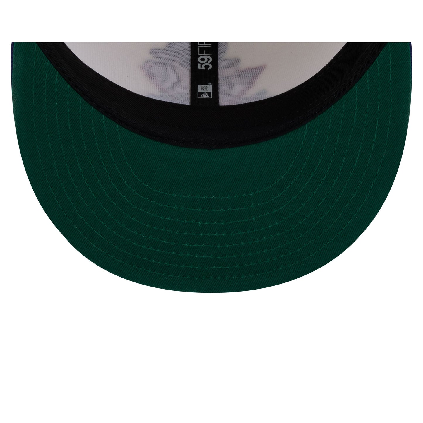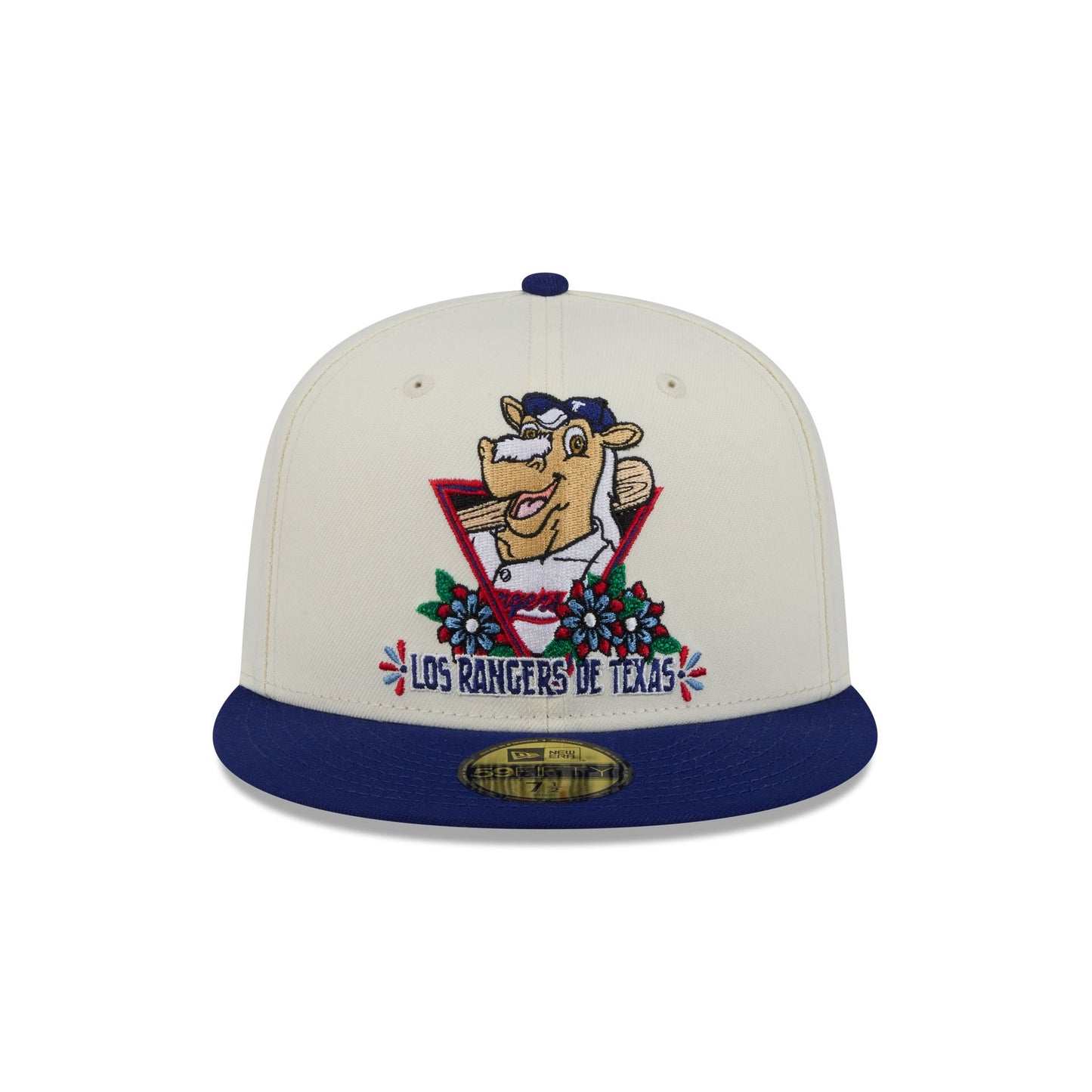 The Texas Rangers Day of the Dead Sugar Skull Mascot 59FIFTY Fitted Cap features an embroidered Rangers Mascot with flowers at the front panels with a skeletal mascot at the right-wear side. Additional details include the MLB Batterman logo at the rear and a green undervisor.