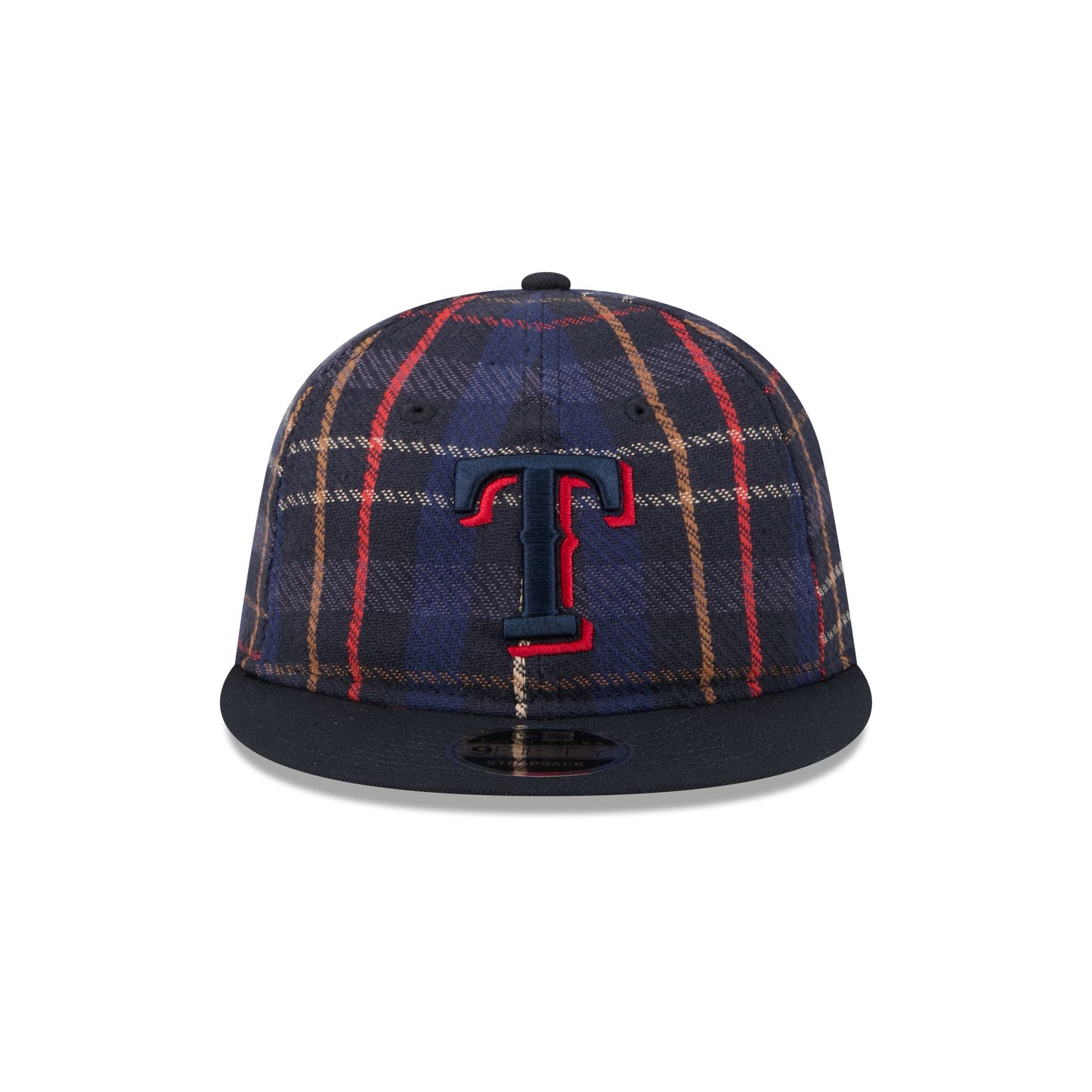 The Texas Rangers Grunge Plaid Retro Crown 9FIFTY Adjustable Cap features an embroidered Rangers logo at the front panels with an adjustable leather strap closure at the rear and a navy undervisor.