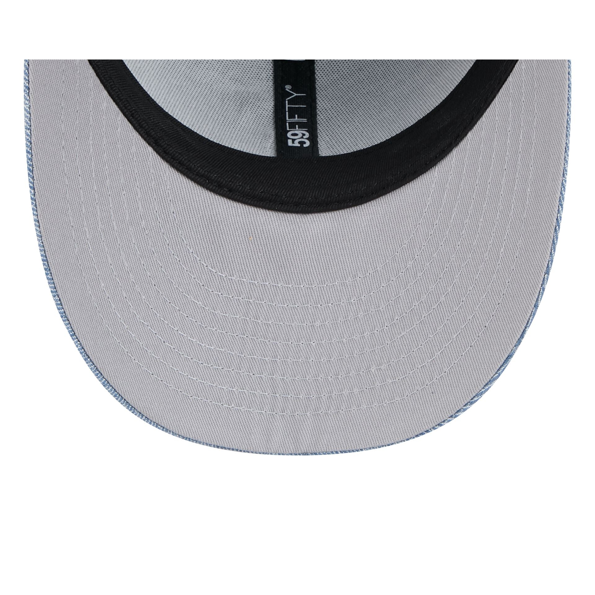 The Texas Rangers Hand Stitched Chambray Low Profile 59FIFTY Fitted Cap features an embroidered Rangers logo at the front panels with a matching MLB Batterman logo at the rear. Additional details include white stitch design throughout the cap and a gray undervisor.
