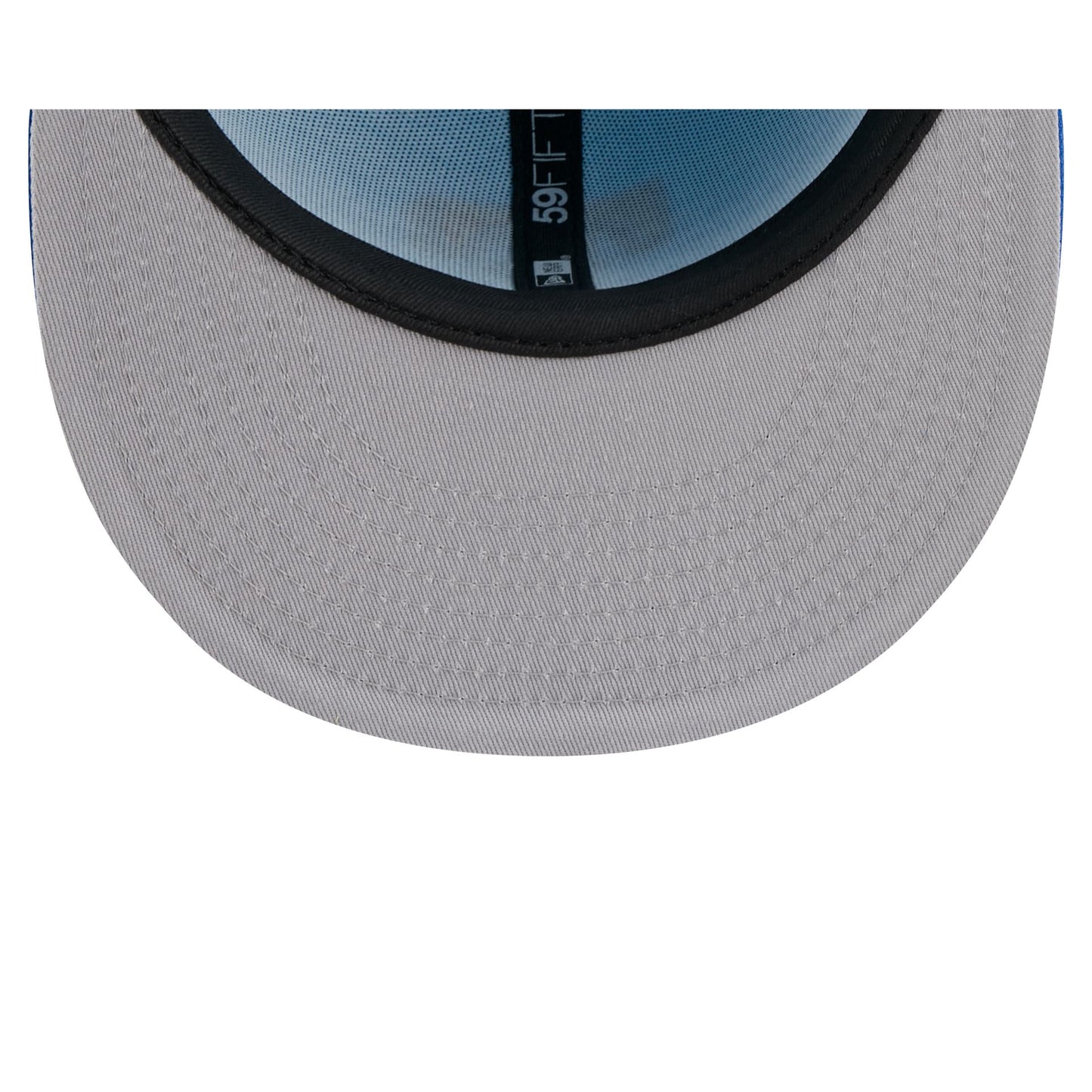 The Texas Rangers Independence Day 2025 59FIFTY Fitted Cap features an embroidered American flag themed Rangers logo at the front panels with a matching MLB Batterman logo at the rear, a blue visor, and a gray undervisor.