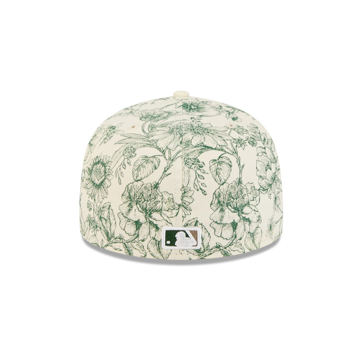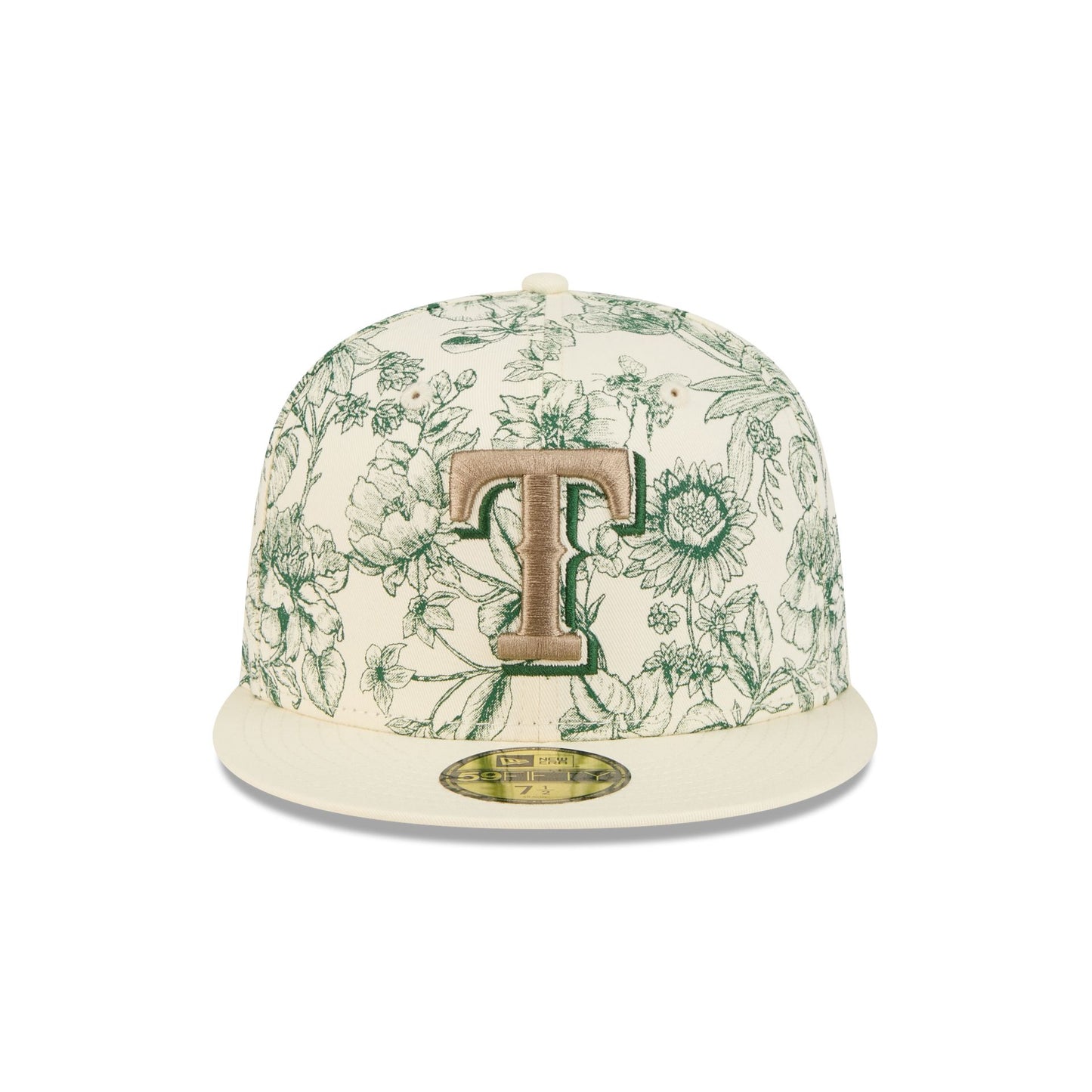 The Texas Rangers Spring Floral 59FIFTY Fitted Cap features an embroidered Rangers logo at the front panels with a matching MLB Batterman logo at the rear and a chrome visor. Additional details include a floral print cotton twill all over fabrication and a 2011 World Series patch at the right-wear side.