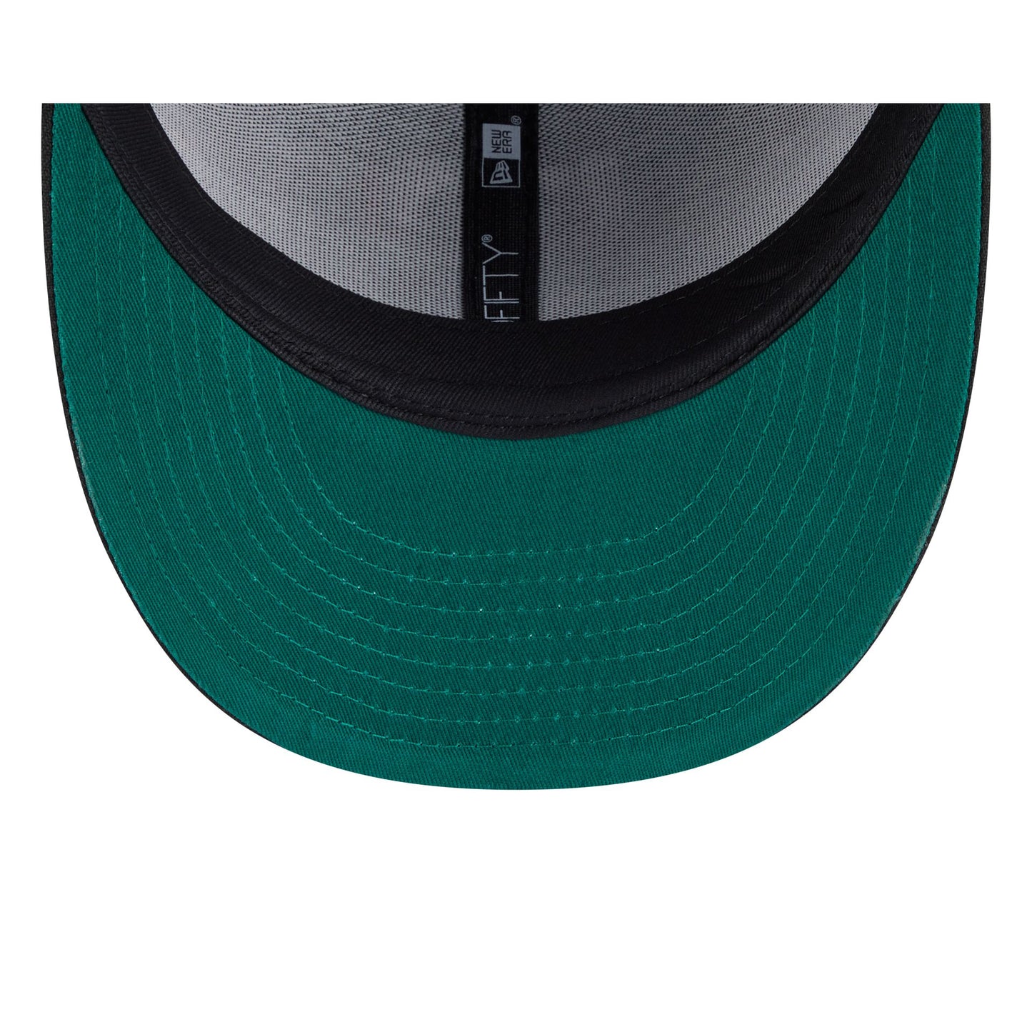 The Texas Rangers Tonal Florals Black Pre-Curved 59FIFTY Fitted Cap features an embroidered Rangers logo at the front panels with a team color visor and a green undervisor. Additional details include chainstitched embroidered flowers with handstitched beading at the left-wear side and a matching MLB Batterman logo at the rear.