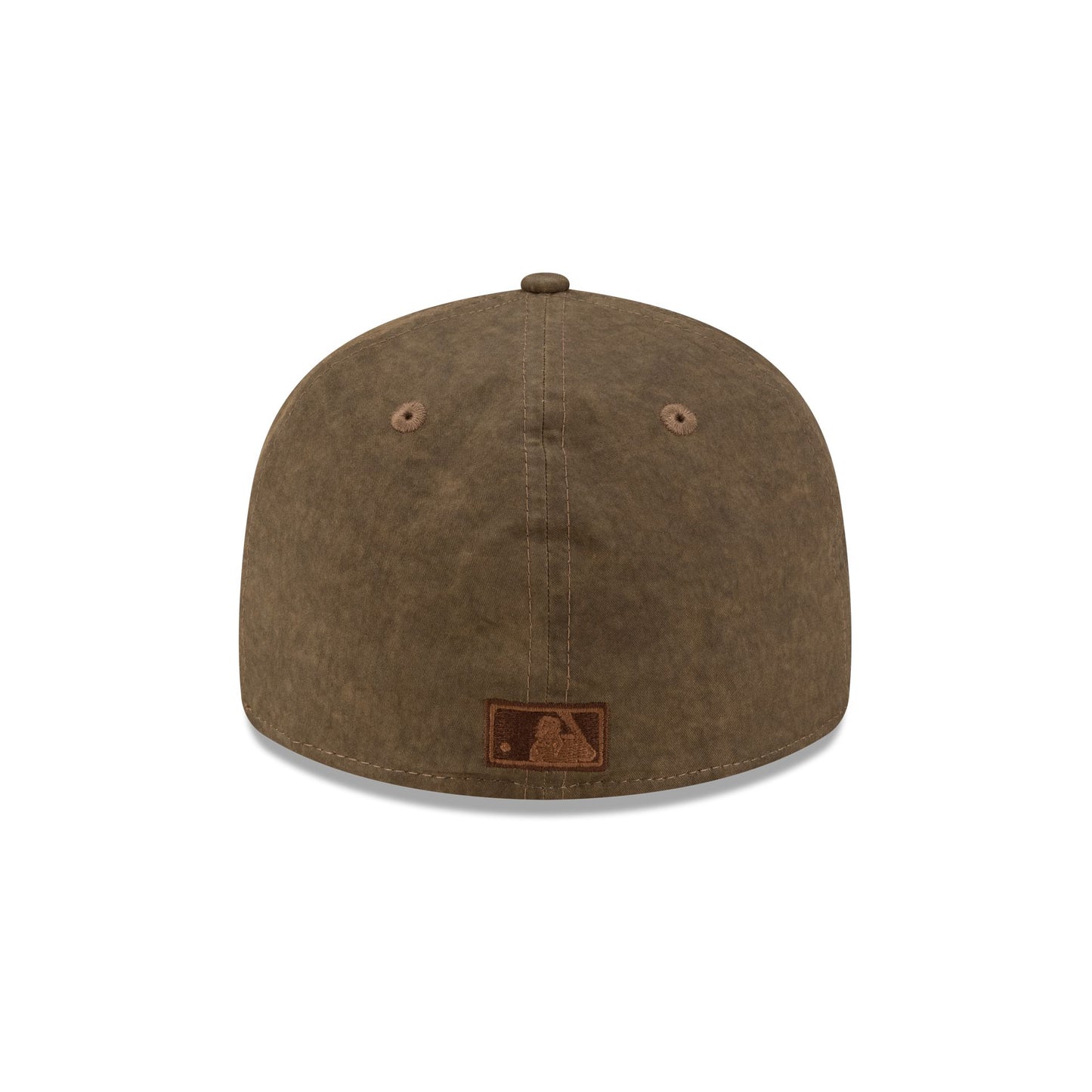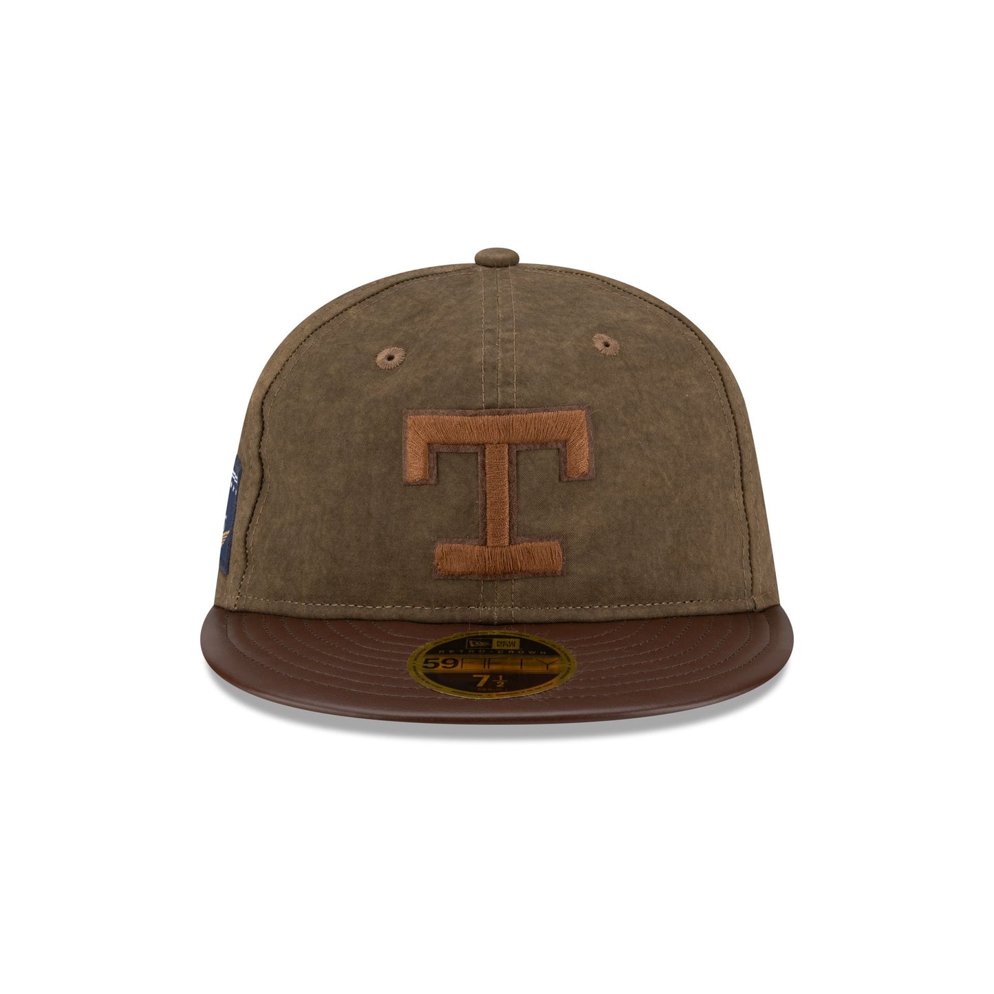 The Texas Rangers Utility Linen Retro Crown 59FIFTY Fitted Cap features an embroidered Rangers logo at the front panels with a team patch at the right-wear side. Additional details include a faux leather visor and the MLB Batterman logo at the rear.