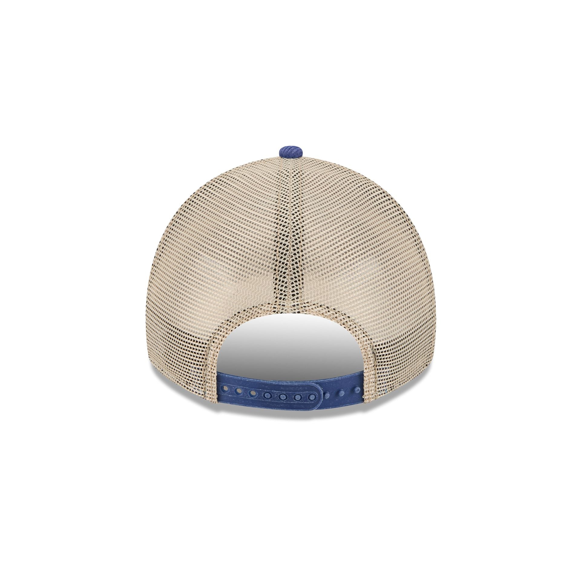 The Texas Rangers Vintage Landscape 9TWENTY A-Frame Trucker features an embroidered Rangers Vintage Landscape patch at the front panels with a team logo at the right-wear side. Additional details include an adjustable snapback closure at the rear and a gray undervisor.