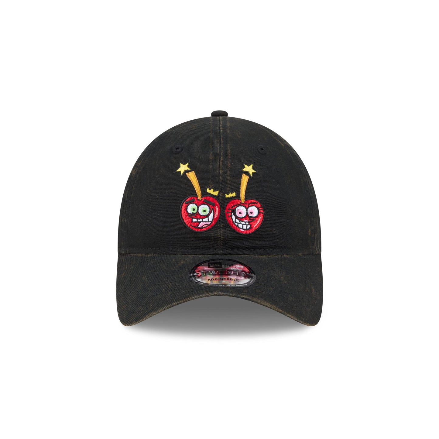 The Fairly OddParents Cherries 9TWENTY Adjustable Cap features an embroidered The Fairly OddParents Cosmo and Wanda as cherries at the front panels. Additional details include an acid wash fabrication throughout, a patterned undervisor, and an adjustable D-Ring closure at the rear.