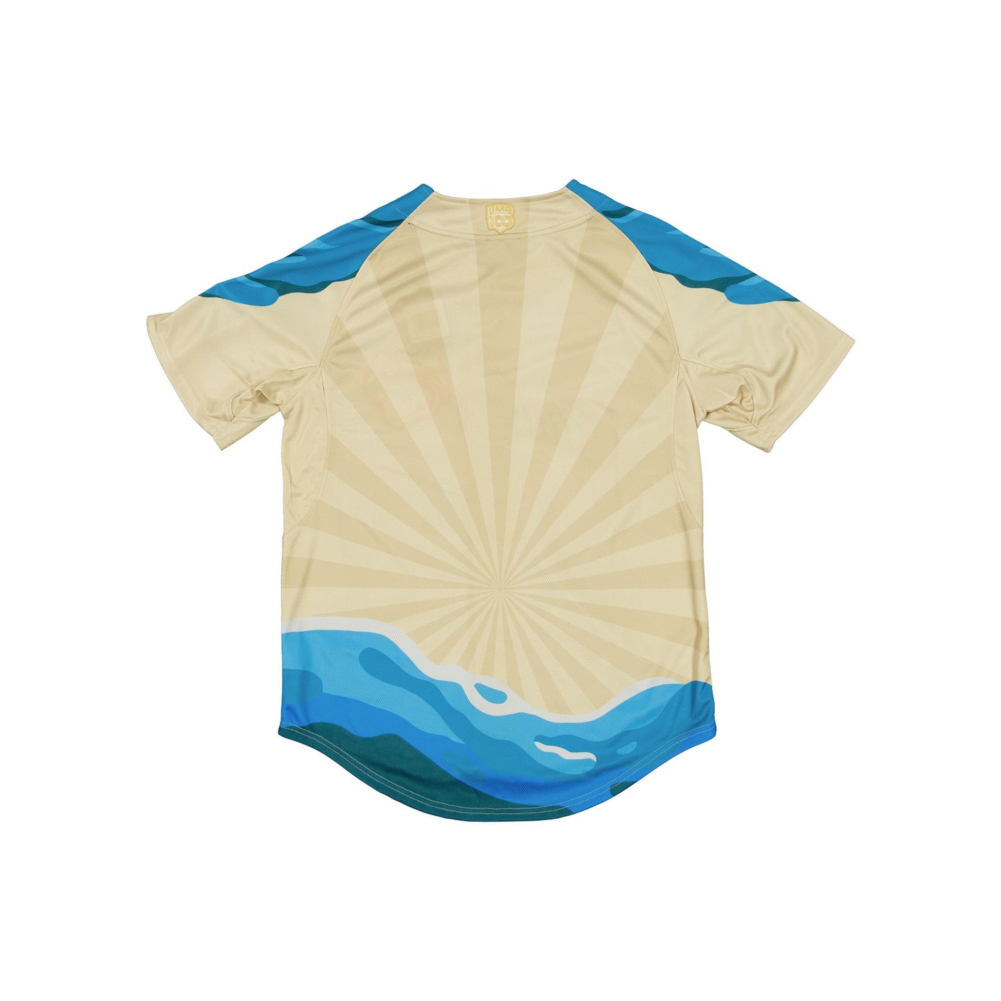The Tigres de Quintana Roo LMB 100th Anniversary Waves Alt Jersey features an embroidered Tigres logo and wordmark at the chest with a New Era Official Merchandise patch at the front hemline. Additional details include a 70th Aniversário team patch at the right sleeve with a Fernando 34 patch at the left sleeve and a LMB 100th Anniversary logo at the rear.