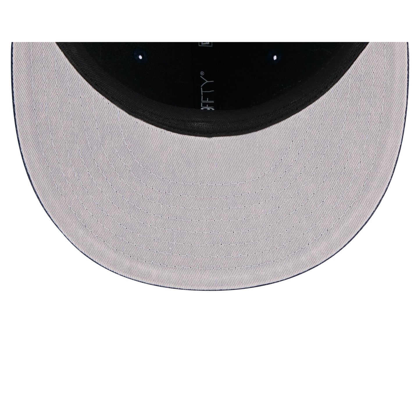 The Tom and Jerry Tom & Jerry 85th Anniversary Blue 9FIFTY Snapback features an embroidered Tom Cat at the front panels with an 85th Anniversary patch at the right-wear side. Additional details include a snapback closure at the rear and a gray undervisor.