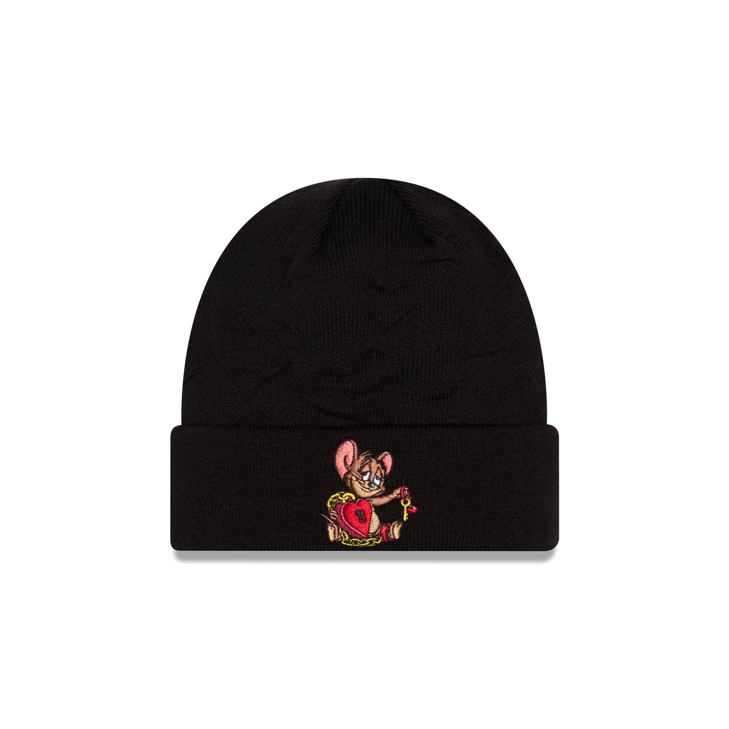 The Tom and Jerry Lock and Key Cuff Knit features an embroidered Jerry heart lock and key patch at the front with a New Era Flag at the left-wear side and a heart patterned crown.