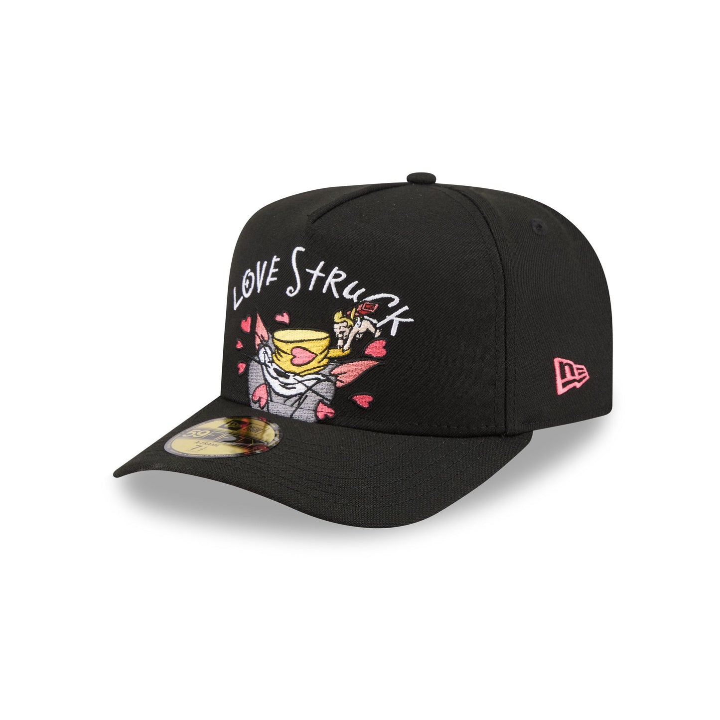The Tom and Jerry Love Struck Pre Curved 59FIFTY A-Frame Fitted Cap features an embroidered Love Sturck wordmark and Cupid hammered Tom graphic at the front panel with a love struck Tom patch at the rear and a hot pink undervisor.