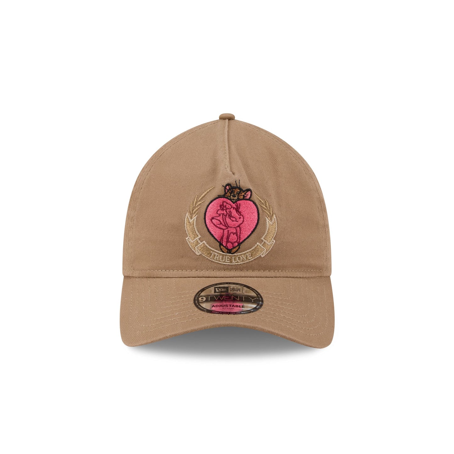 The Tom and Jerry True Love 9TWENTY A-Frame Adjustable Cap features an embroidered Jerry holding a Cherie Mouse heart with a True Love banner at the front with an adjustable D-Ring closure at the rear and a tan undervisor.
