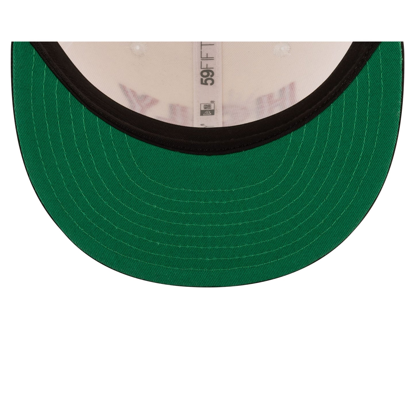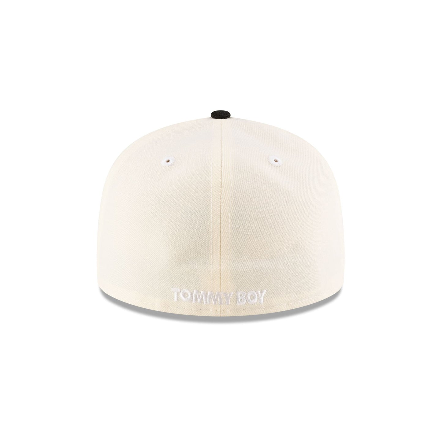 The Tommy Boy Holy Schnikes 59FIFTY Fitted Cap features an embroidered "Holy Schnikes" broken glass graphic at the front panels with a "That's gonna leave a mark" cursive wordmark at the right-wear side. Additional details include a Tommy Boy wordmark at the rear and a green undervisor.