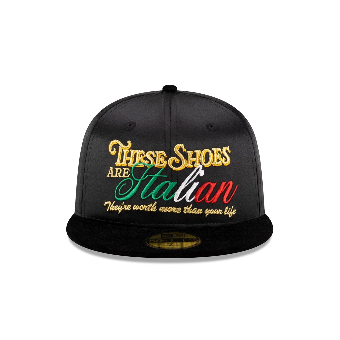 The Tommy Boy Italian Shoes 59FIFTY Fitted Cap features an embroidered "These Shoes are Italian" wordmark against a black satin fabrication throughout.