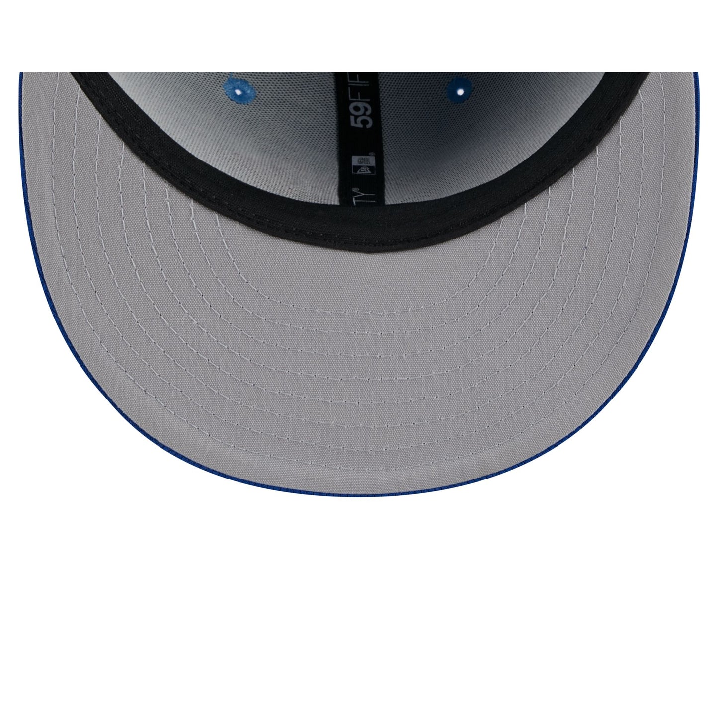 The Toronto Blue Jays 2025 Batting Practice 59FIFTY Fitted Cap features an embroidered Blue Jays logo at the front panels with a matching MLB Batterman logo at the rear. Additional details include a pivot knit fabrication, a blue visor, and a gray undervisor.