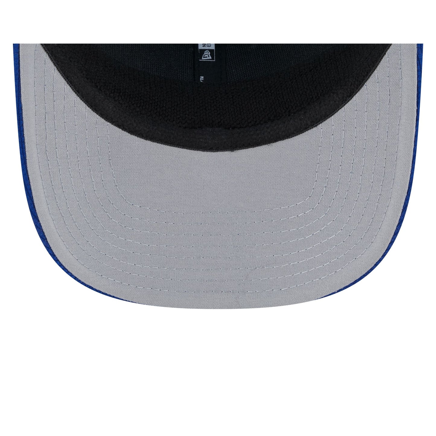 The Toronto Blue Jays 2025 Batting Practice 9SEVENTY Trucker Hat features an embroidered Blue Jays logo at the front panels with a mesh back, a snapback closure at the rear, and a gray undervisor.