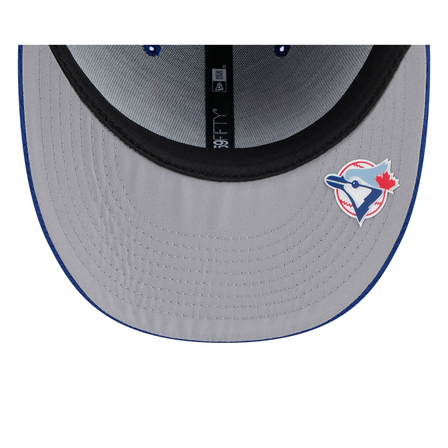 The Toronto Blue Jays 2025 Clubhouse Alt Low Profile 59FIFTY Fitted Cap features an embroidered Blue Jays alternate logo at the front panels with a matching MLB Batterman logo at the rear. Additional details include a dashmark mesh fabrication and a silicone logo on a gray undervisor.