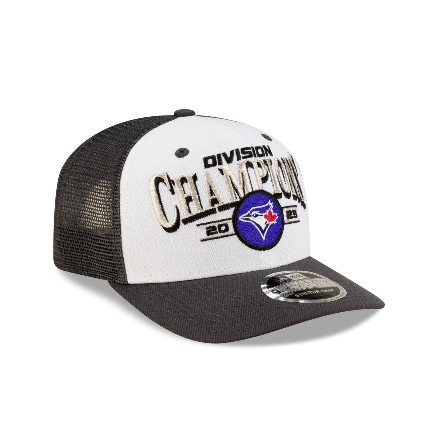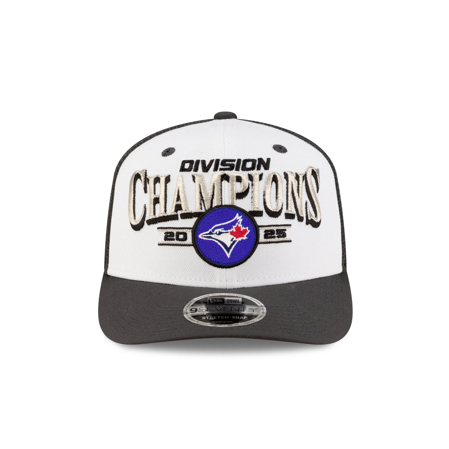 The Toronto Blue Jays 2025 Regular Season Division Champions Locker Room 9SEVENTY Stretch-Snap features an embroidered Blue Jays Division Champions graphic at the front with an adjustable stretch-snap closure at a mesh rear.