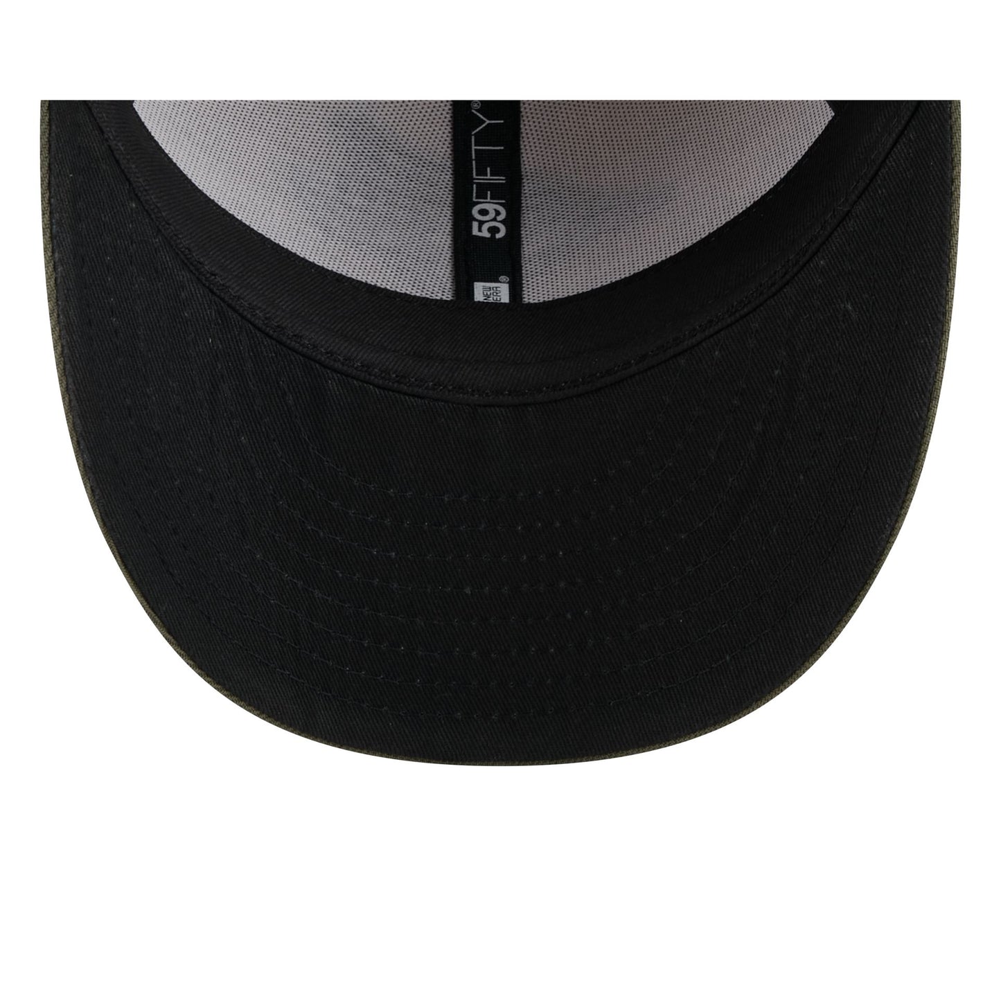 The Toronto Blue Jays Armed Forces Day 2025 Low Profile 59FIFTY Fitted Cap features an embroidered Blue Jays logo at the front panels with a matching MLB Batterman logo at the rear. Additional details include the American Flag embroidered at the right-wear side and a black undervisor. This cap comes with a pre-curved visor.
