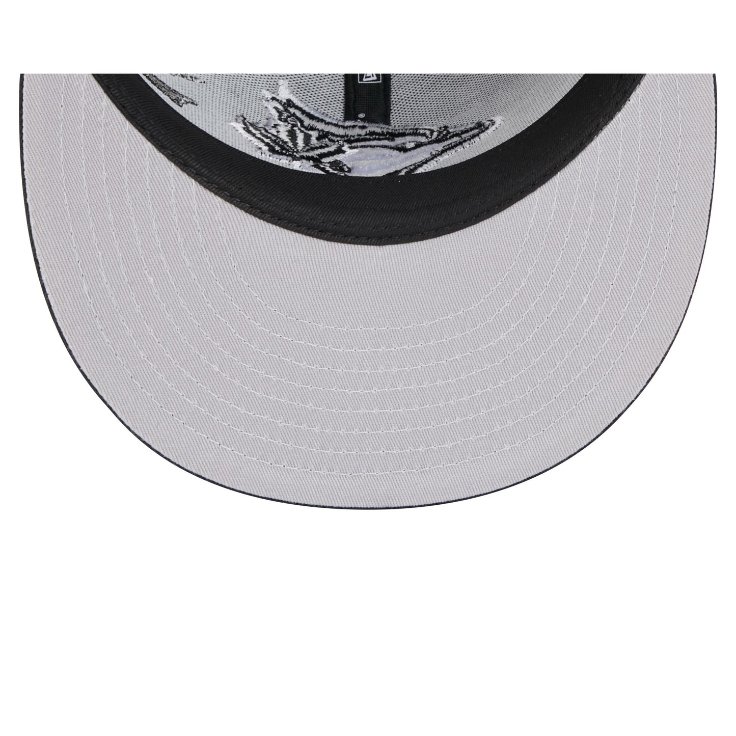 The Toronto Blue Jays City Art 9FIFTY Snapback features an embroidered Blue Jays black and white logo at the front panels and an embroidered city banner with art at the right-wear side. Additional details include a snapback closure at the rear and a gray undervisor.
