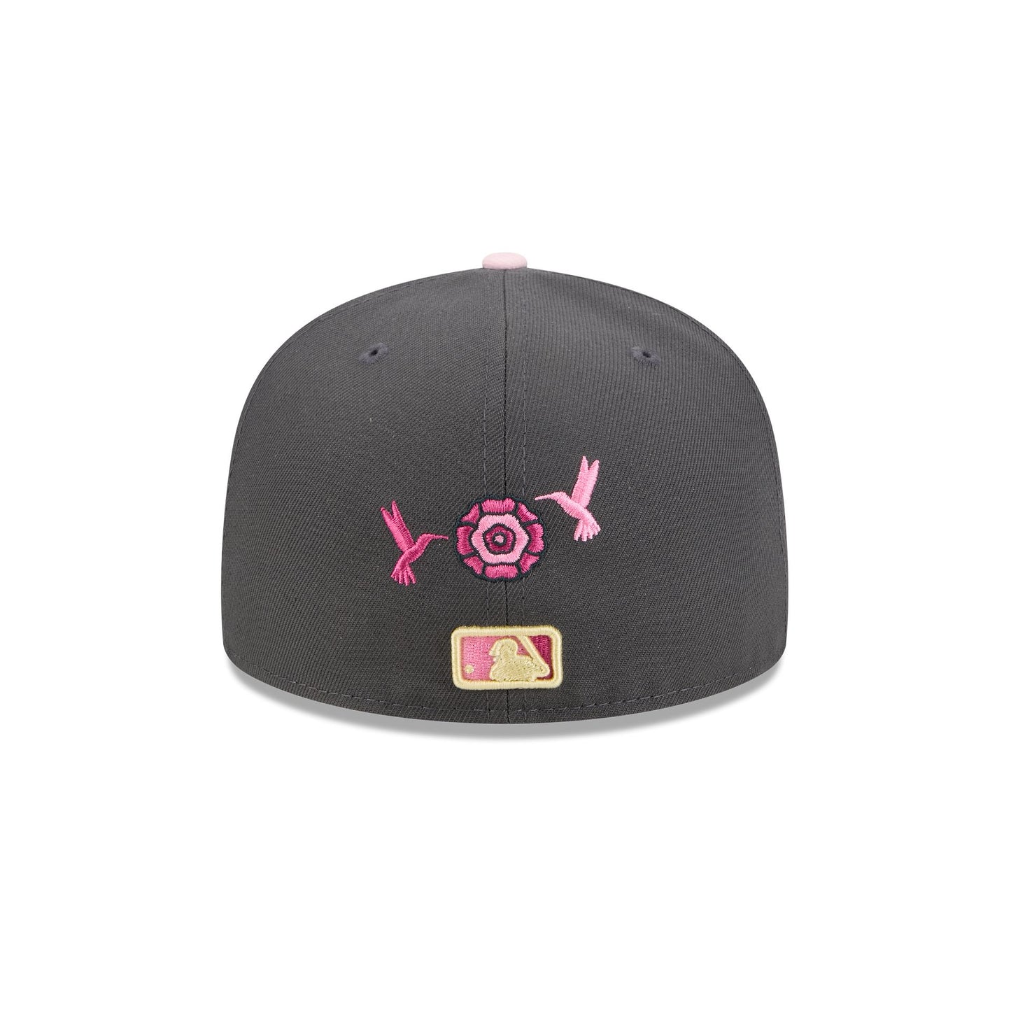 The Toronto Blue Jays Day of the Dead Graphite 59FIFTY Fitted Cap features an embroidered Blue Jays logo at the front panels with marigold (cempasúchil) and hummingbird designs throughout, representing the Legend of Xóchitl and Huitzilin. Additional details include a team patch at the right-wear side and a matching MLB Batterman logo at the rear.
