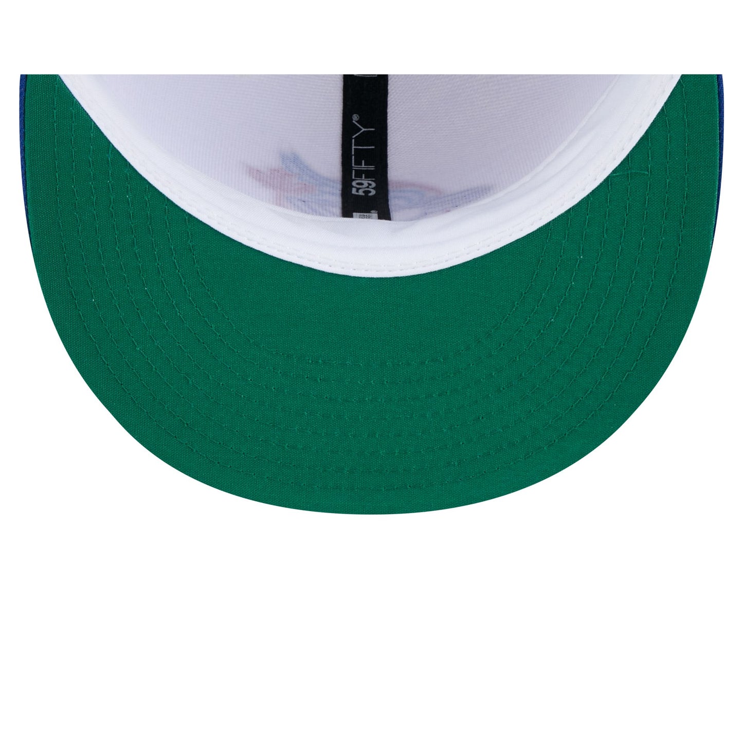 The Toronto Blue Jays Hall of Fame 2025 59FIFTY Fitted Cap features an embroidered Blue Jays Cooperstown logo at the front panels with a matching MLB Batterman logo at the rear, a National Baseball Hall of Fame patch at the right-wear side, and a green undervisor.