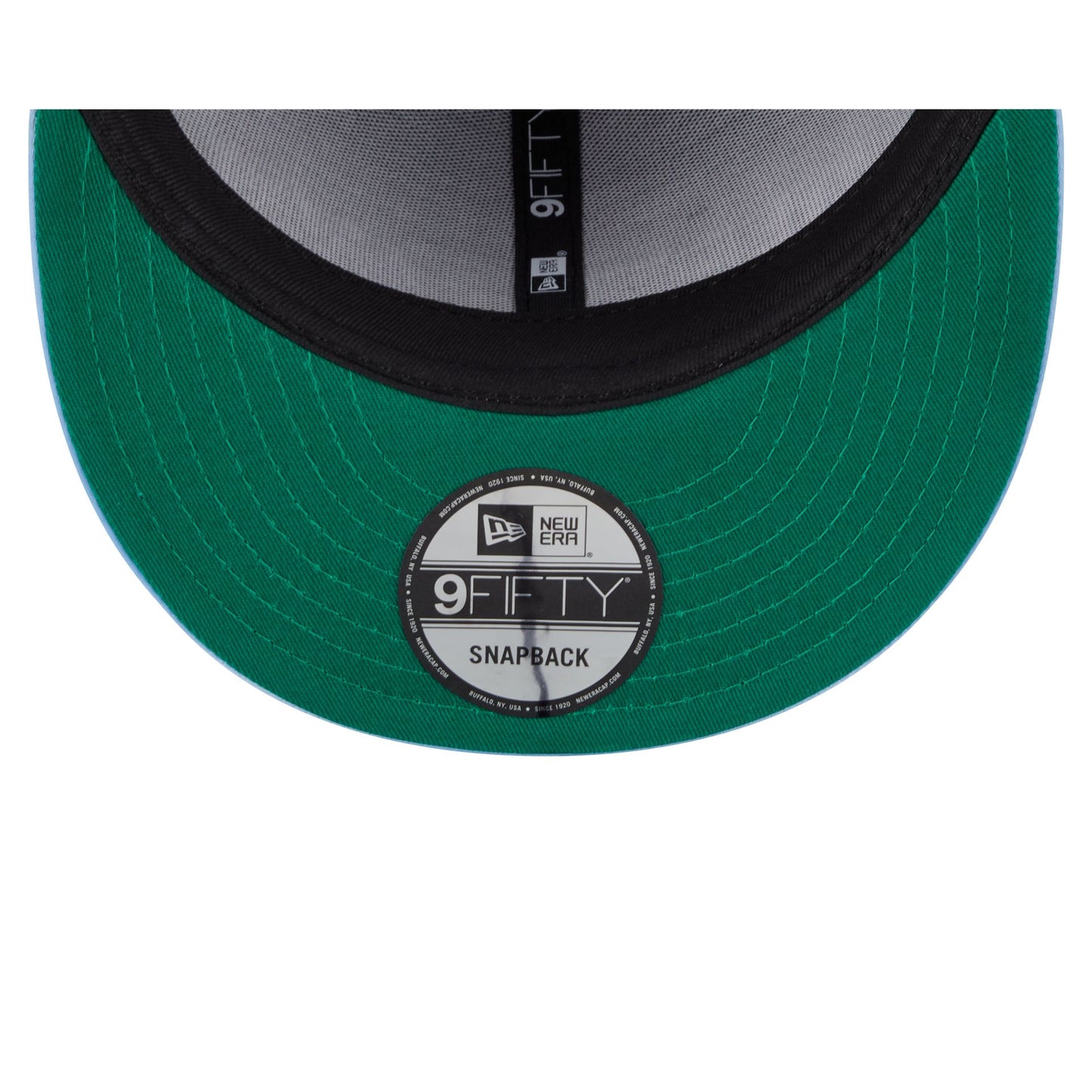 The Toronto Blue Jays Satin Pin 9FIFTY Snapback features an embroidered Blue Jays wordmark at the front panels against a satin fabrication throughout the cap and a logo at the right-wear side. Additional details include a New Era Pin at the front left panel a snapback closure at the rear, and a green undervisor.