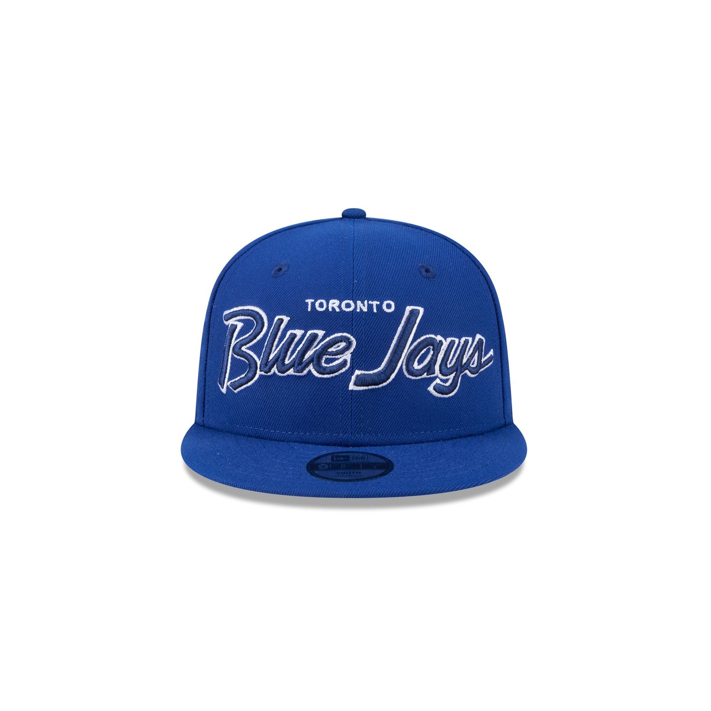 The Toronto Blue Jays Kids 9FIFTY Snapback Hat features an embroidered Blue Jays wordmark at the front panels with a matching team logo at the right-wear side. Additional details include a gray undervisor and a snapback closure at the rear.