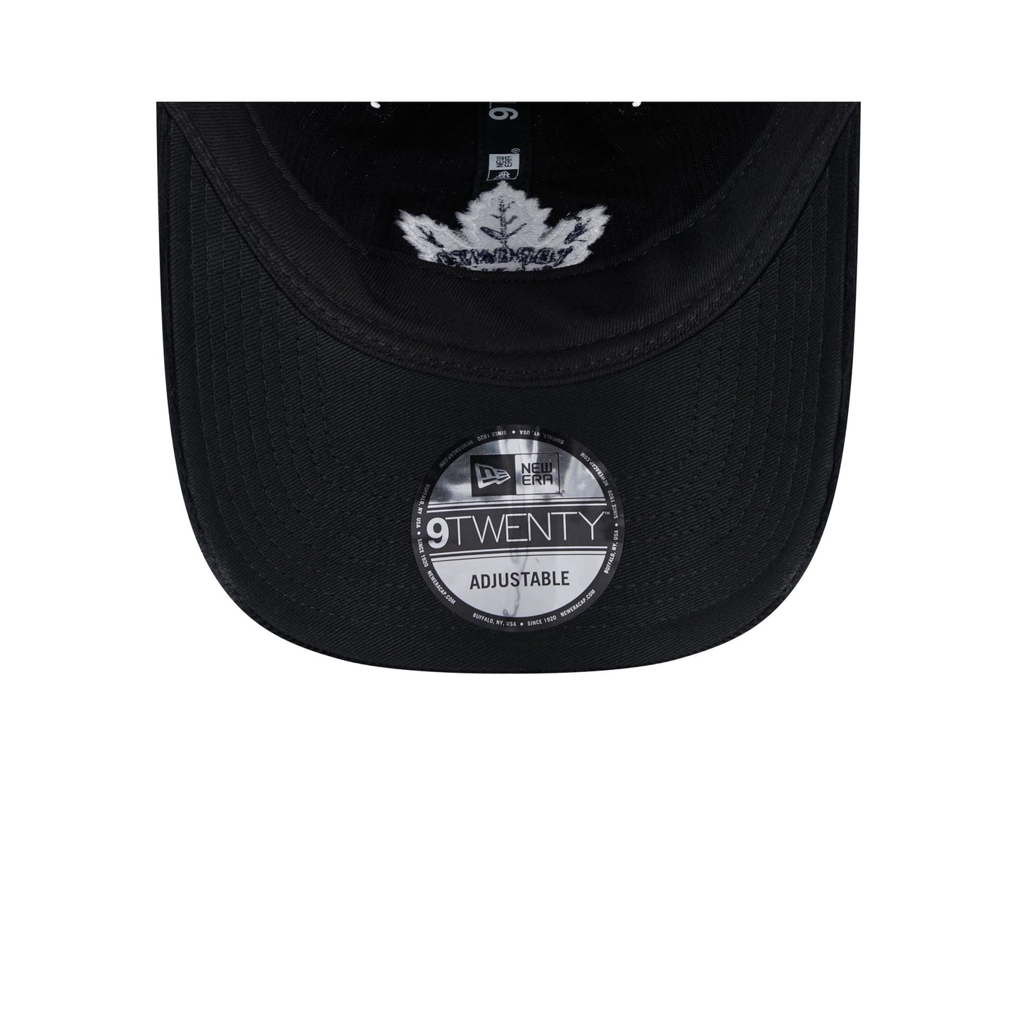 The Toronto Maple Leafs Corded 9TWENTY Adjustable Hat features an embroidered Maple Leafs logo at the front panels against a black corduroy fabrication throughout and an adjustable D-Ring closure at the rear.