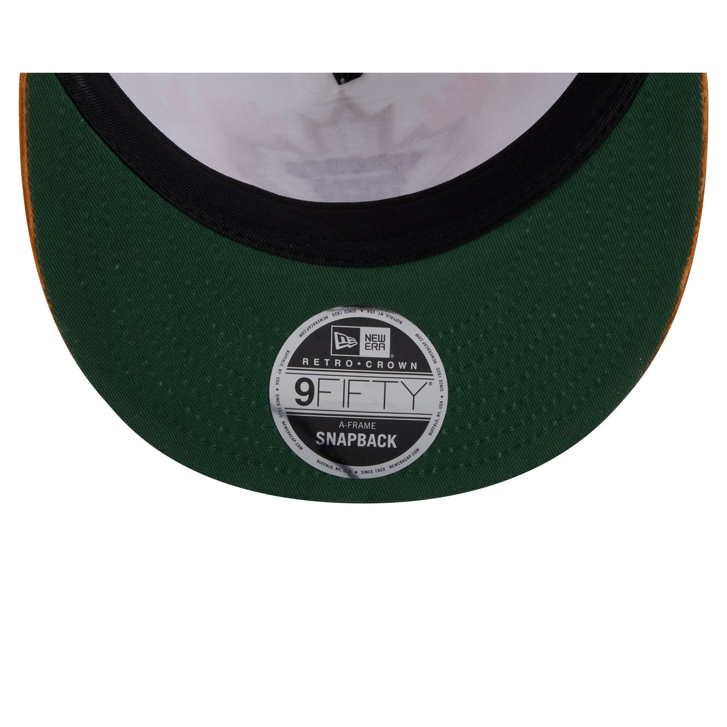 The Toronto Maple Leafs Fall Forest Retro Crown 9FIFTY Adjustable Cap features an embroidered Maple Leafs wool yarn logo at the front panels against an image of a fall forest throughout the cap. Additional details include a corduroy visor and an adjustable buckle closure at the rear.
