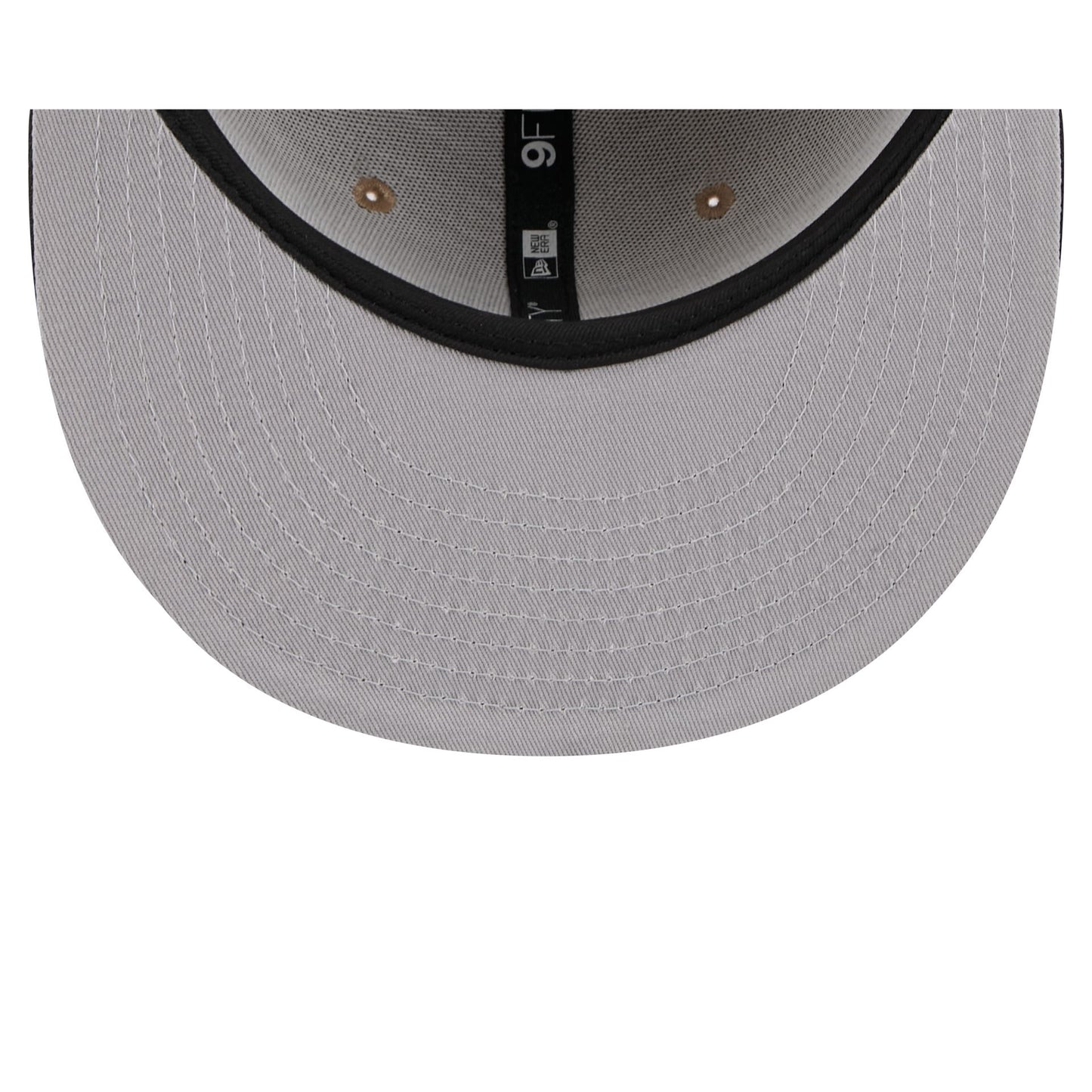 The Toronto Raptors 2024 Draft 9FIFTY Snapback features an embroidered Raptors logo and team wordmark at the front panels with the official NBA Logoman above a snapback closure at the rear and a gray undervisor.