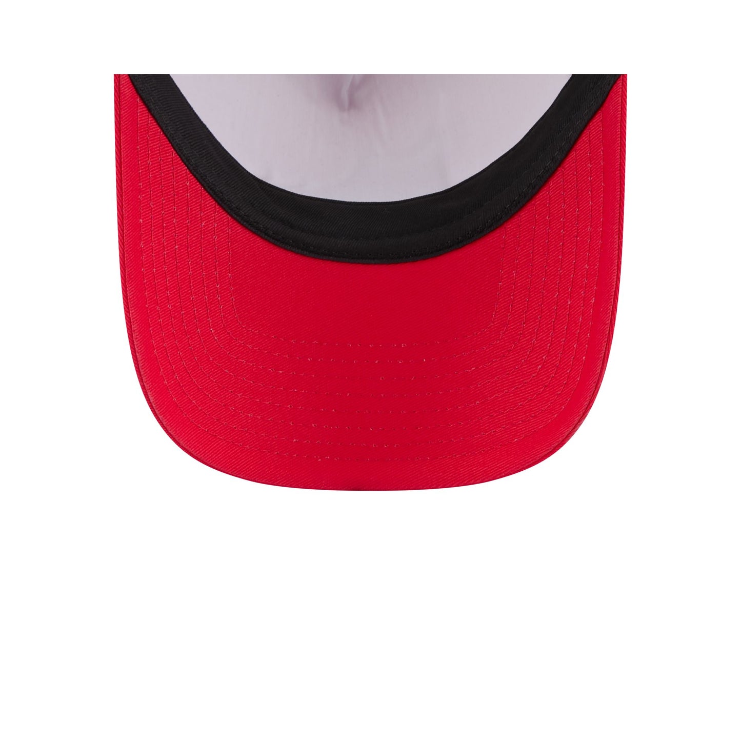 The Toronto Raptors 2025 All-Star Game Fan Pack 9FORTY A-Frame Trucker features an embroidered Raptors sneaker logo at the front panels with a mesh back and a snapback closure at the rear.