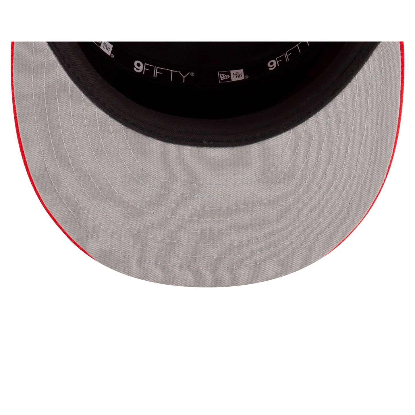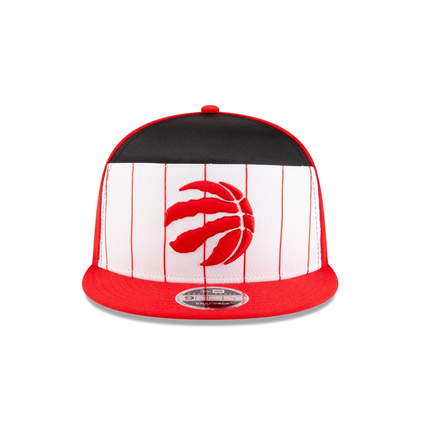 The Toronto Raptors 2025 Tip-Off Split Panel 9FIFTY Snapback features an embroidered Raptors logo at the front panels against a pinstripe jersey fabrication with the NBA Logoman at the right-wear side. Additional details include an adjustable snapback closure at the rear and a gray undervisor.