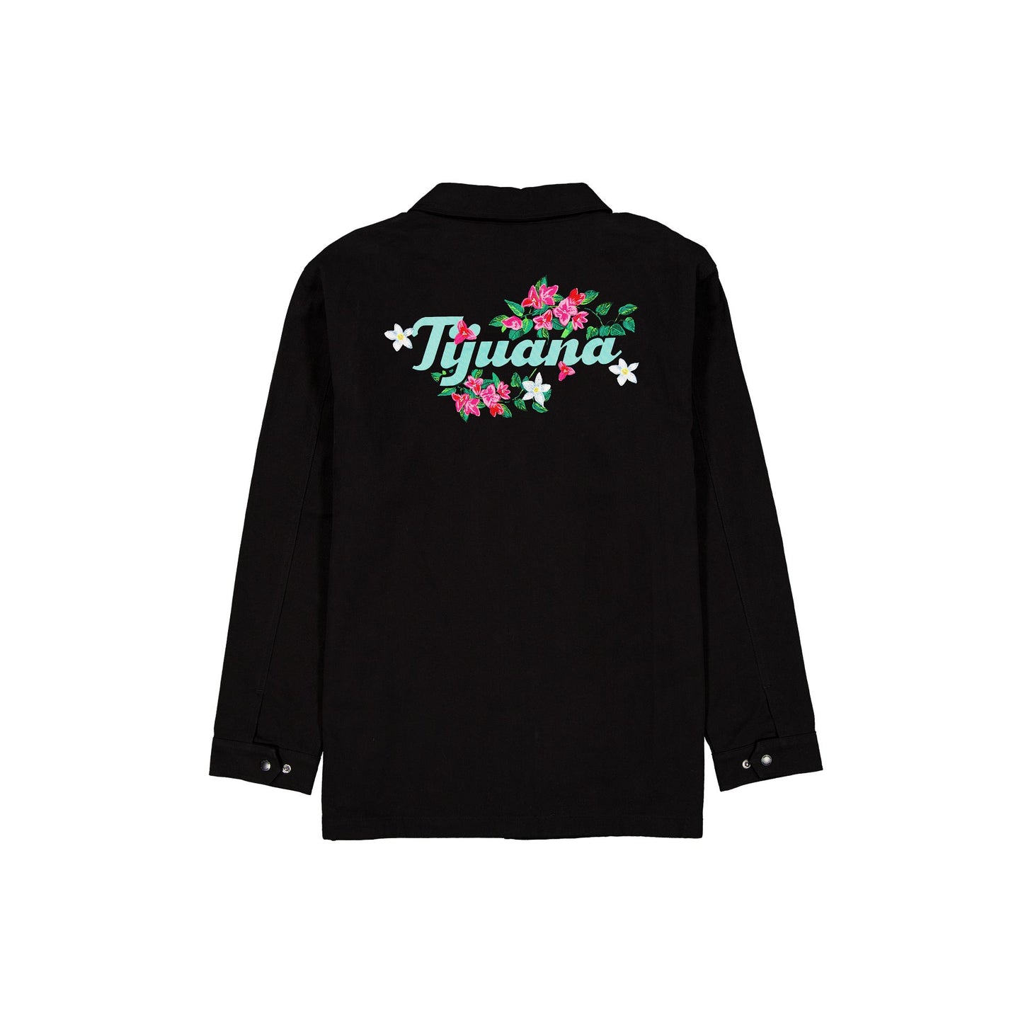 The Toros de Tijuana Black Floral Jacket features an embroidered Toros applique floral logo at the left chest with a matching wordmark at the rear. Additional details include a front button closure, pockets, and adjustable drawstrings at the waist.