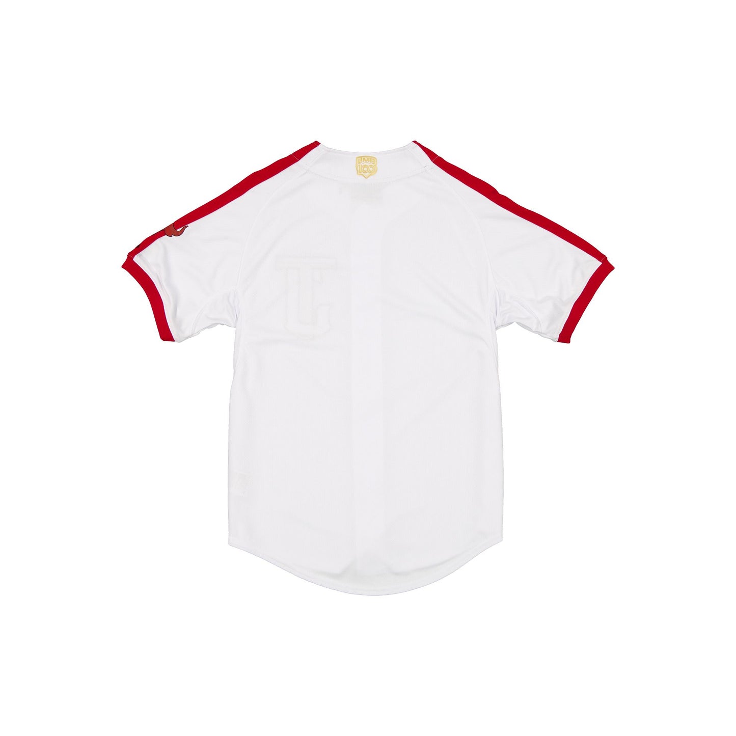 The Toros de Tijuana LMB 100th Anniversary Home Jersey features an embroidered Toros wordmark at the left chest with a New Era Official Merchandise patch at the front hemline, a team logo at the left sleeve, and a LMB 100th Anniversary logo at the rear.