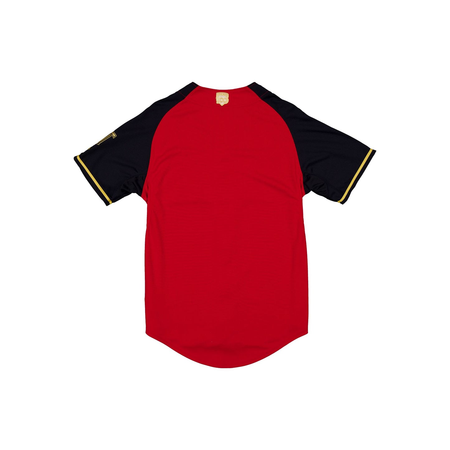 The Toros de Tijuana LMB 100th Anniversary Red Alt Jersey features an embroidered Toros wordmark at the chest with a New Era Official Merchandise patch at the front hemline, a team logo at the left sleeve, and a LMB 100th Anniversary logo at the rear.