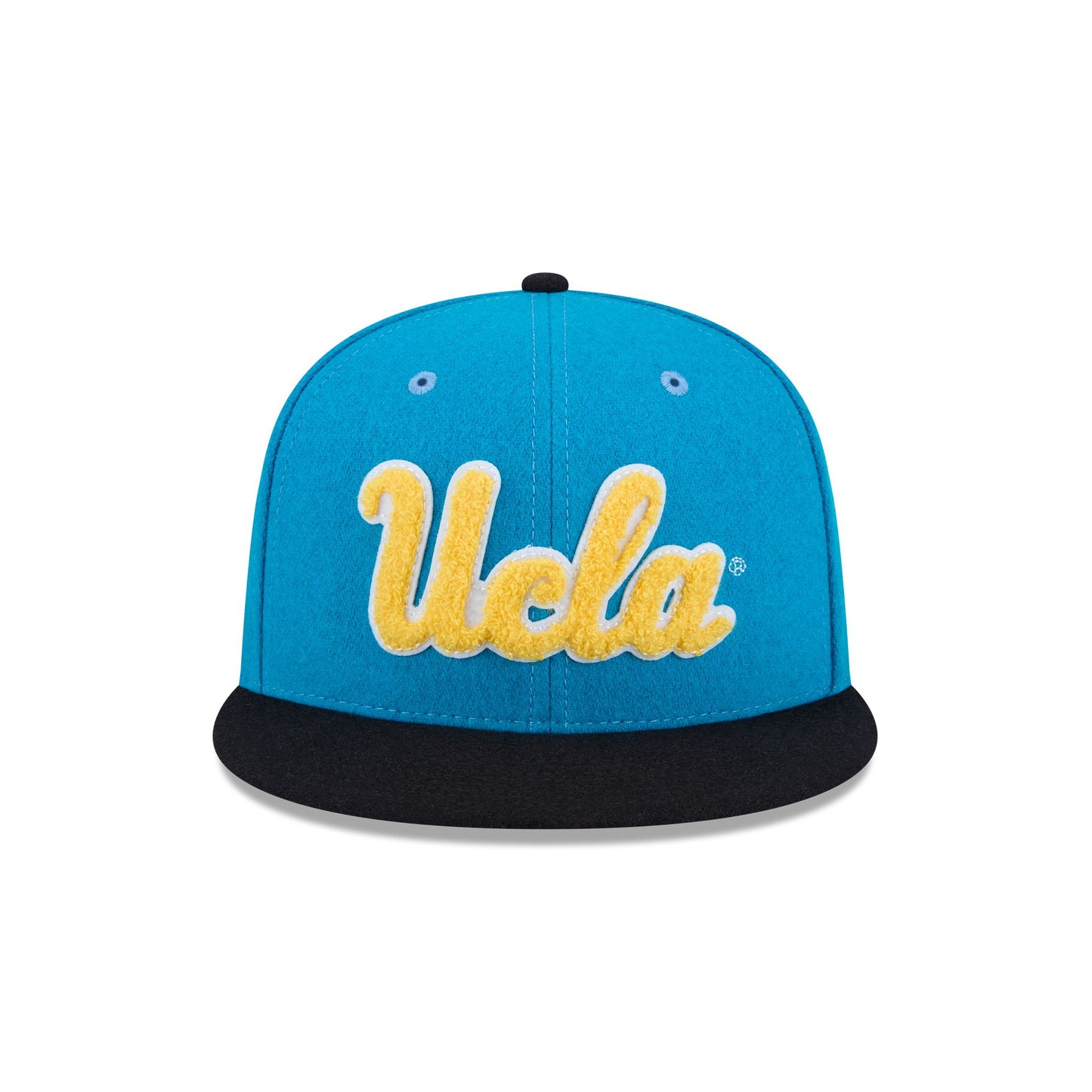 The UCLA Bruins Melton Wool 59FIFTY Fitted Cap features a chenille applique Bruins logo patch at the front panels with an embroidered team wordmark at the rear and a gray undervisor.