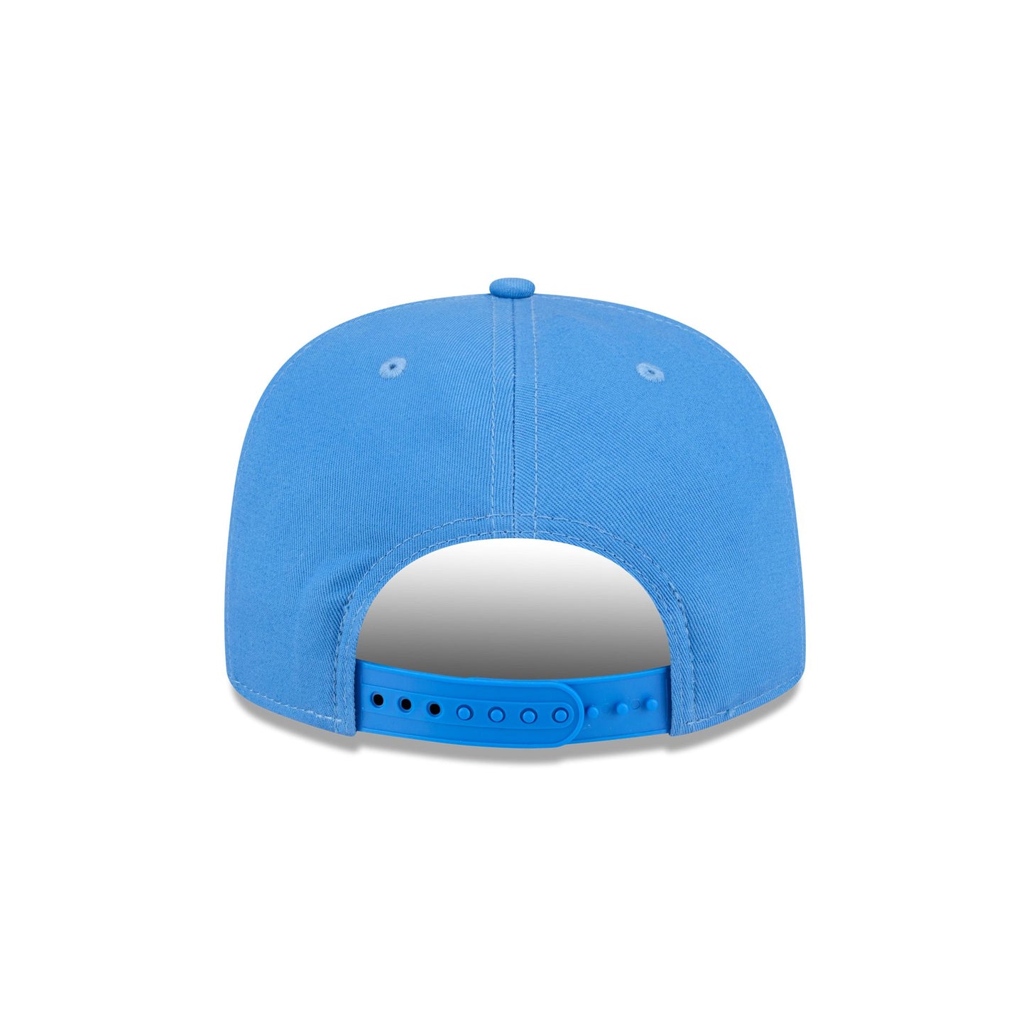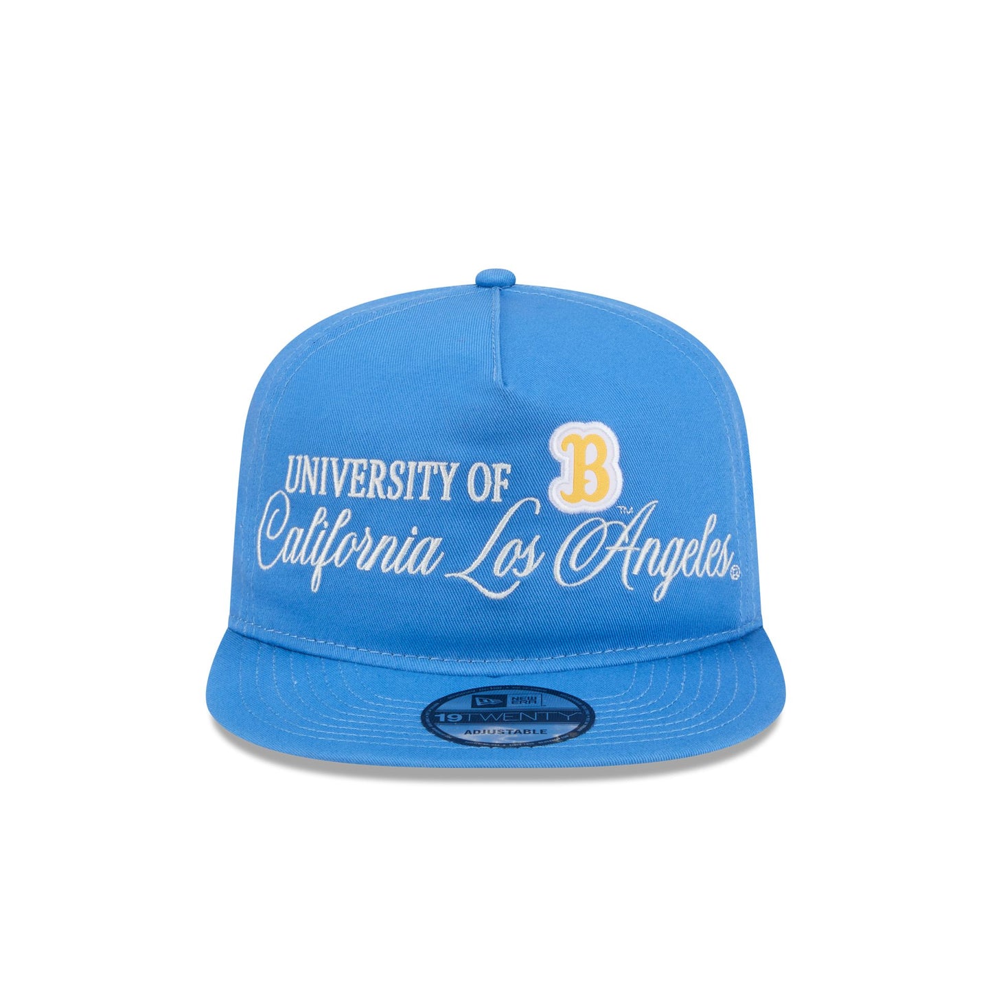 The UCLA Bruins Script 19TWENTY Snapback features an embroidered Bruins script and logo patch at the front panel with a snapback closure at the rear and a green undervisor.