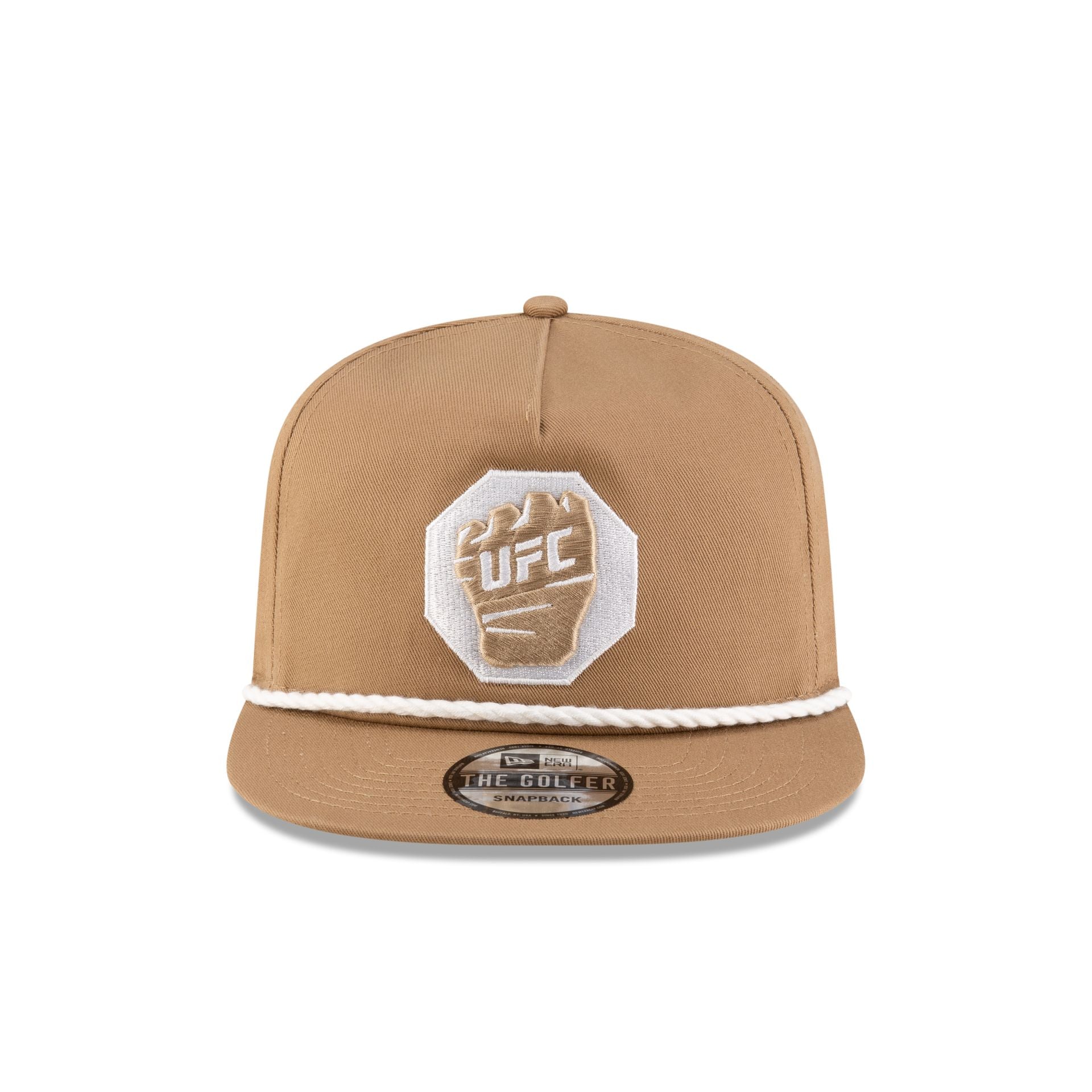 The UFC Mexico Khaki Glove Golfer Hat features an embroidered UFC glove logo at the front panels with the Mexican flag patch at the right-wear side. Additional details include a rope at the base of the crown and a snapback closure at the rear.