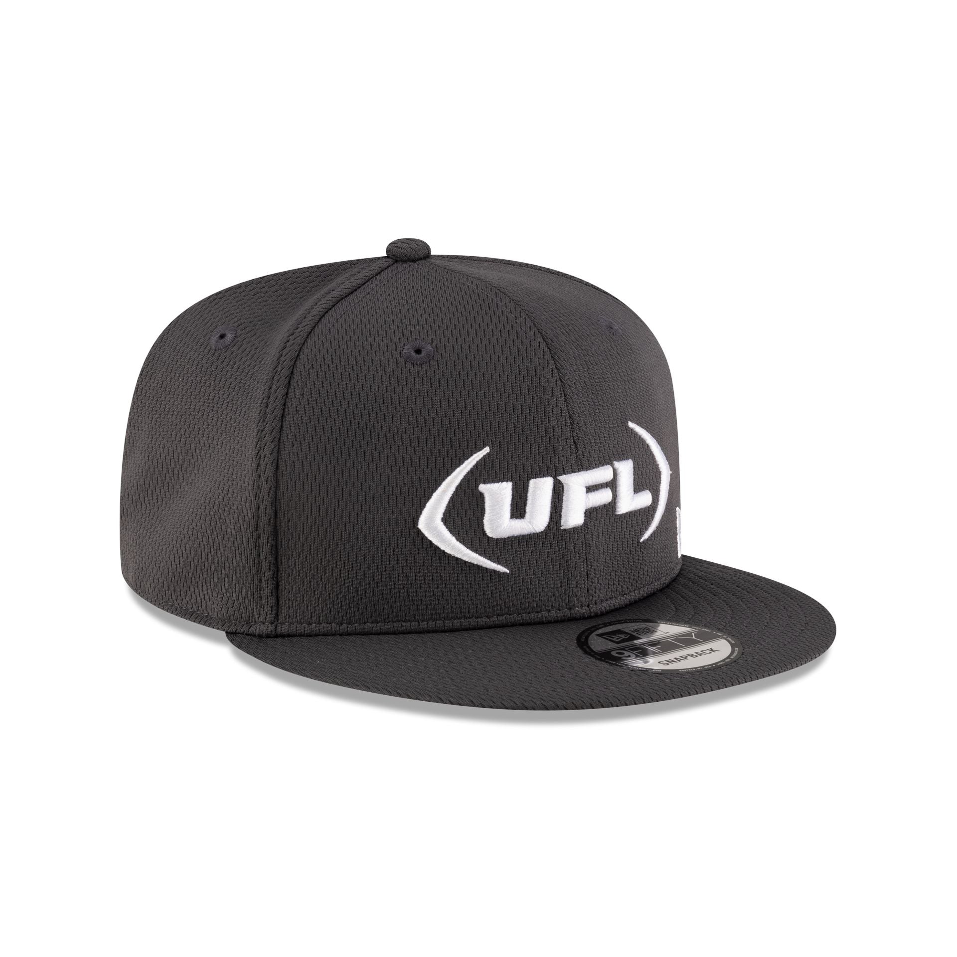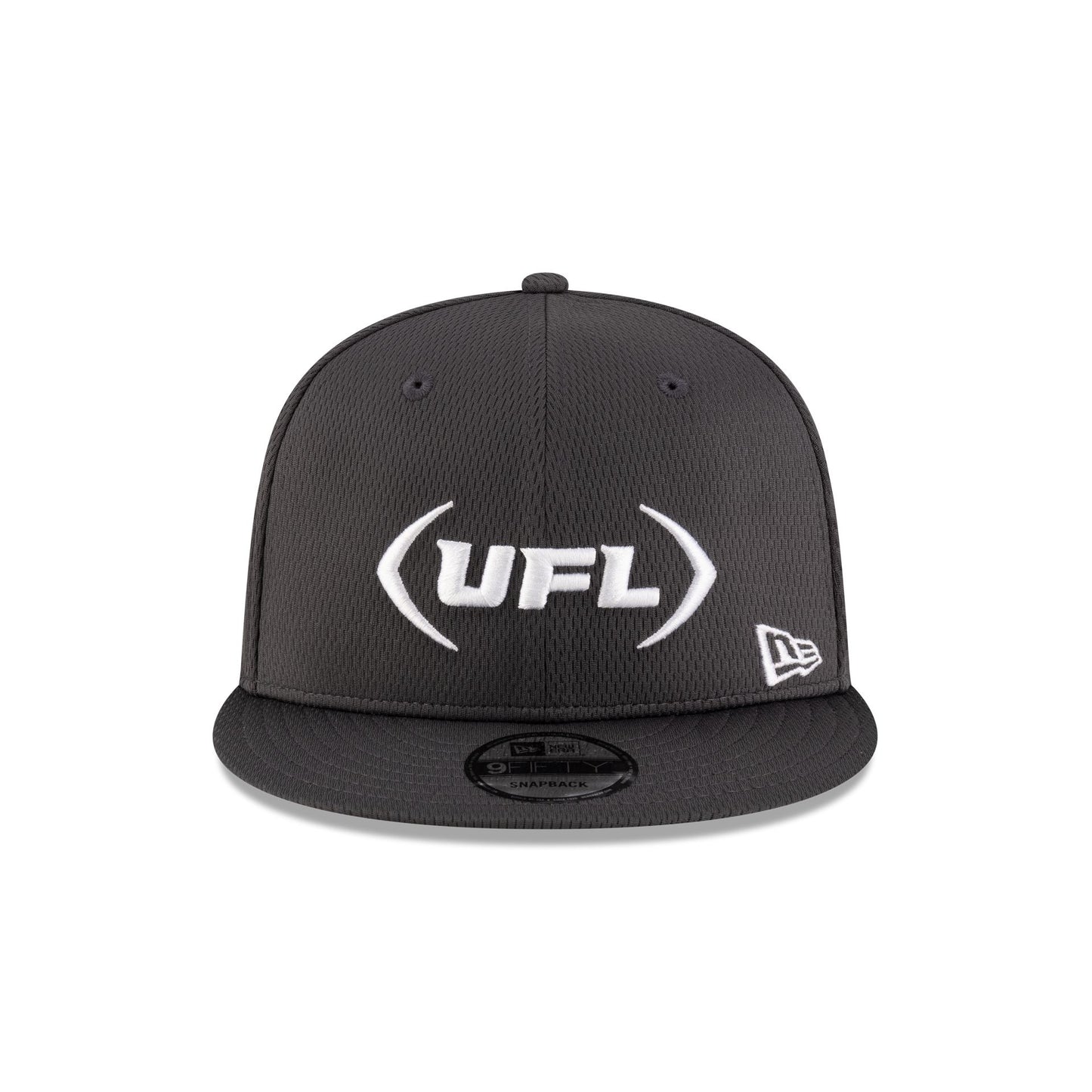 The UFL Gray 9FIFTY Snapback features an embroidered UFL logo at the front panels with the New Era Flag at the left. Additional details include a UFL logo above a snapback closure at the rear and a gray undervisor.