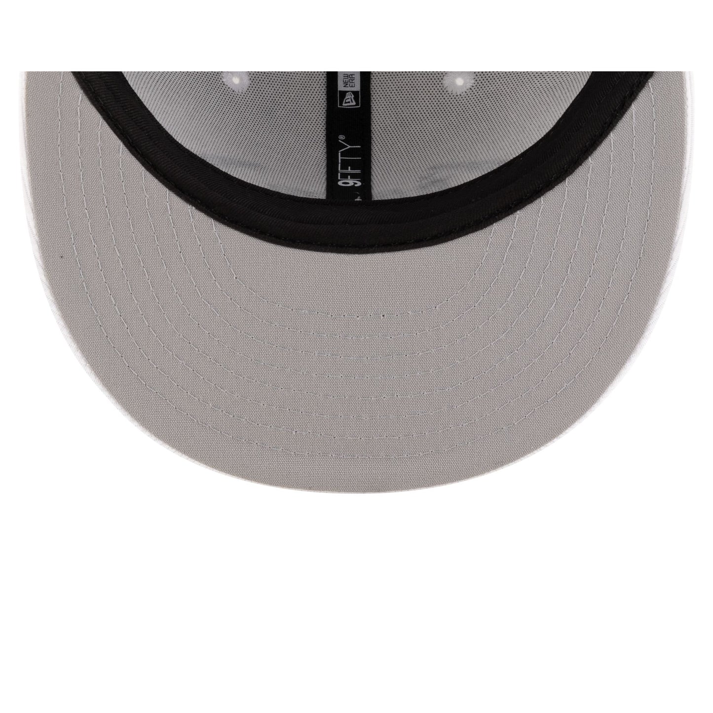 The UFL White 9FIFTY Snapback features an embroidered UFL logo at the front panels with the New Era Flag at the left. Additional details include a UFL logo above a snapback closure at the rear and a gray undervisor.