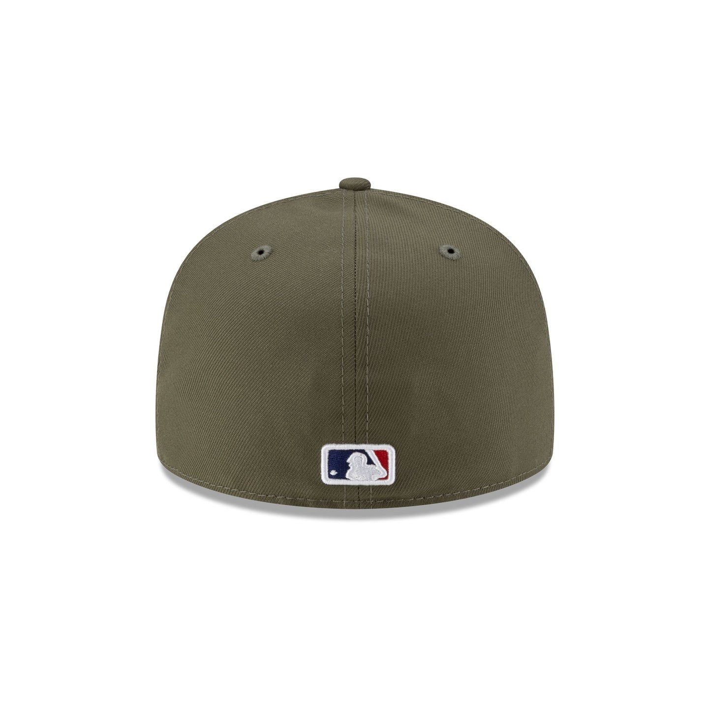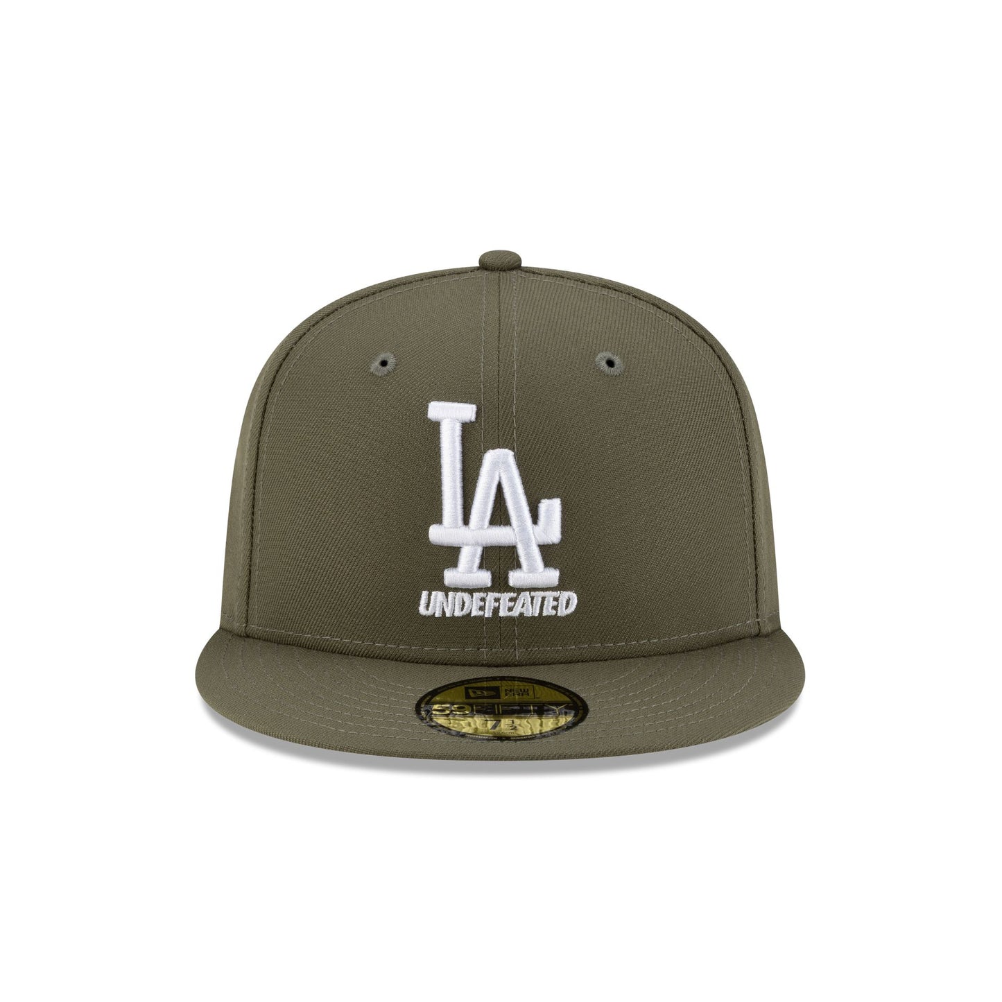 The Undefeated x Los Angeles Dodgers Stacked Olive 59FIFTY Fitted Cap features an embroidered Dodgers Undefeated graphic at the front with a patch at the right-wear side and a matching MLB Batterman logo at the rear.