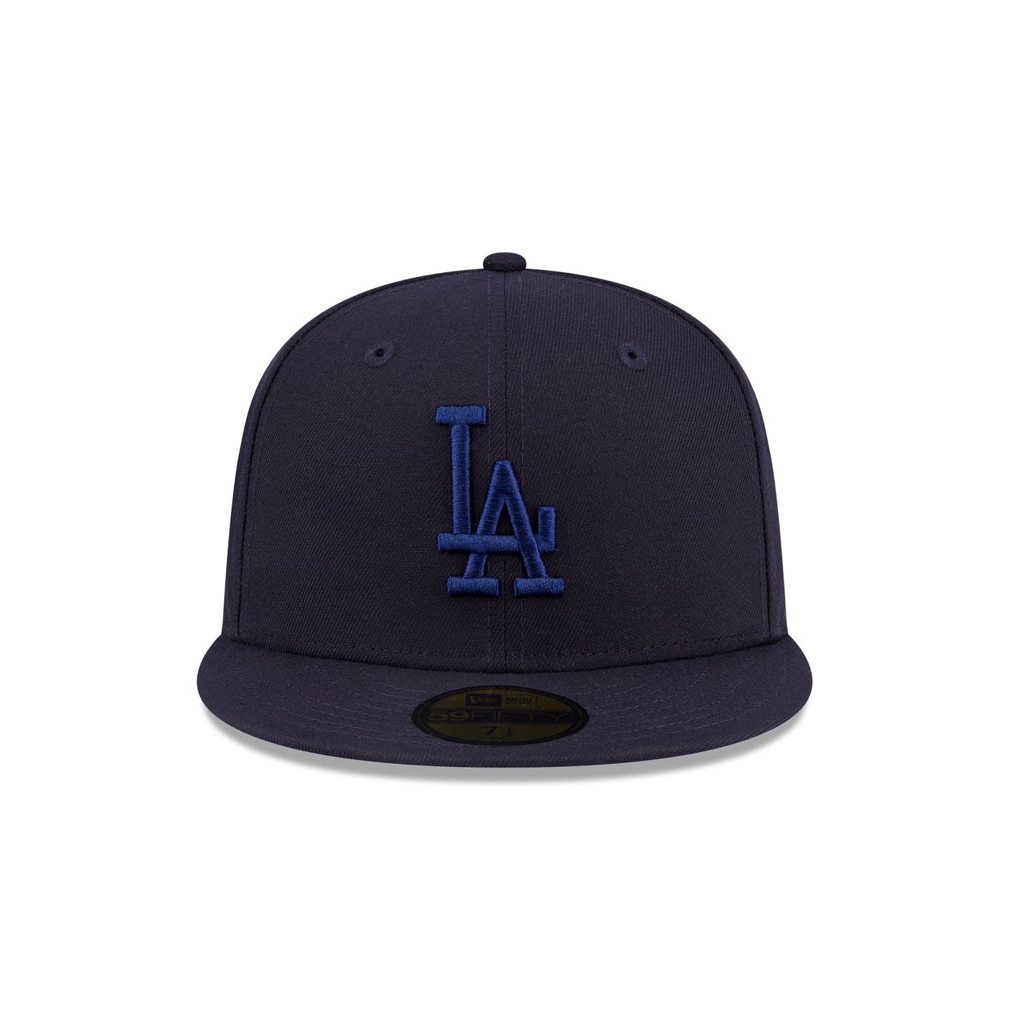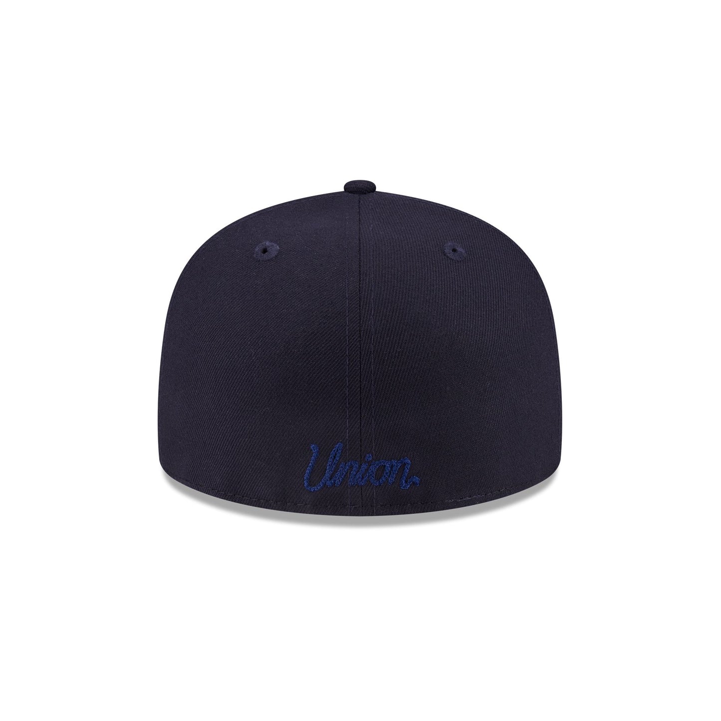 The Union x Los Angeles Dodgers Holiday Navy 59FIFTY Fitted Cap features an embroidered Dodgers logo at the front panels with a Union wordmark at the rear, a Know the Ledge patch at the right-wear side, and a green undervisor.