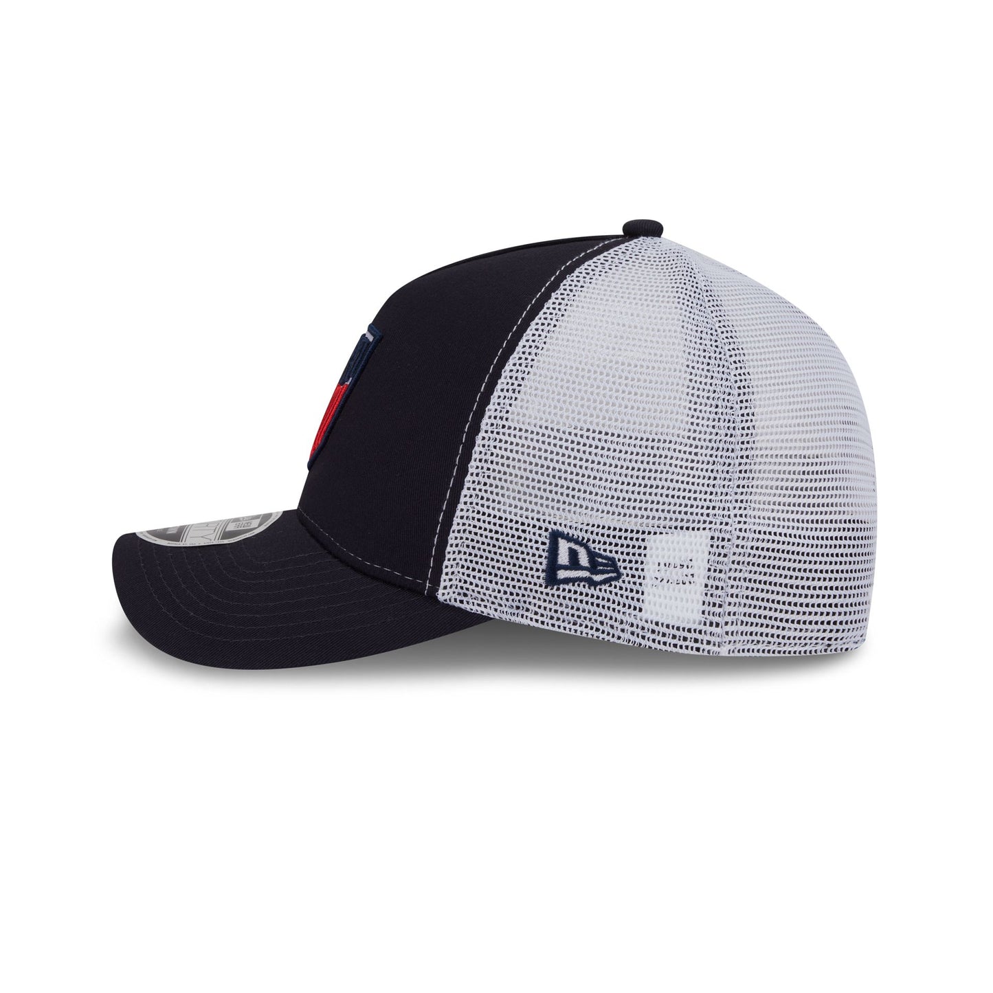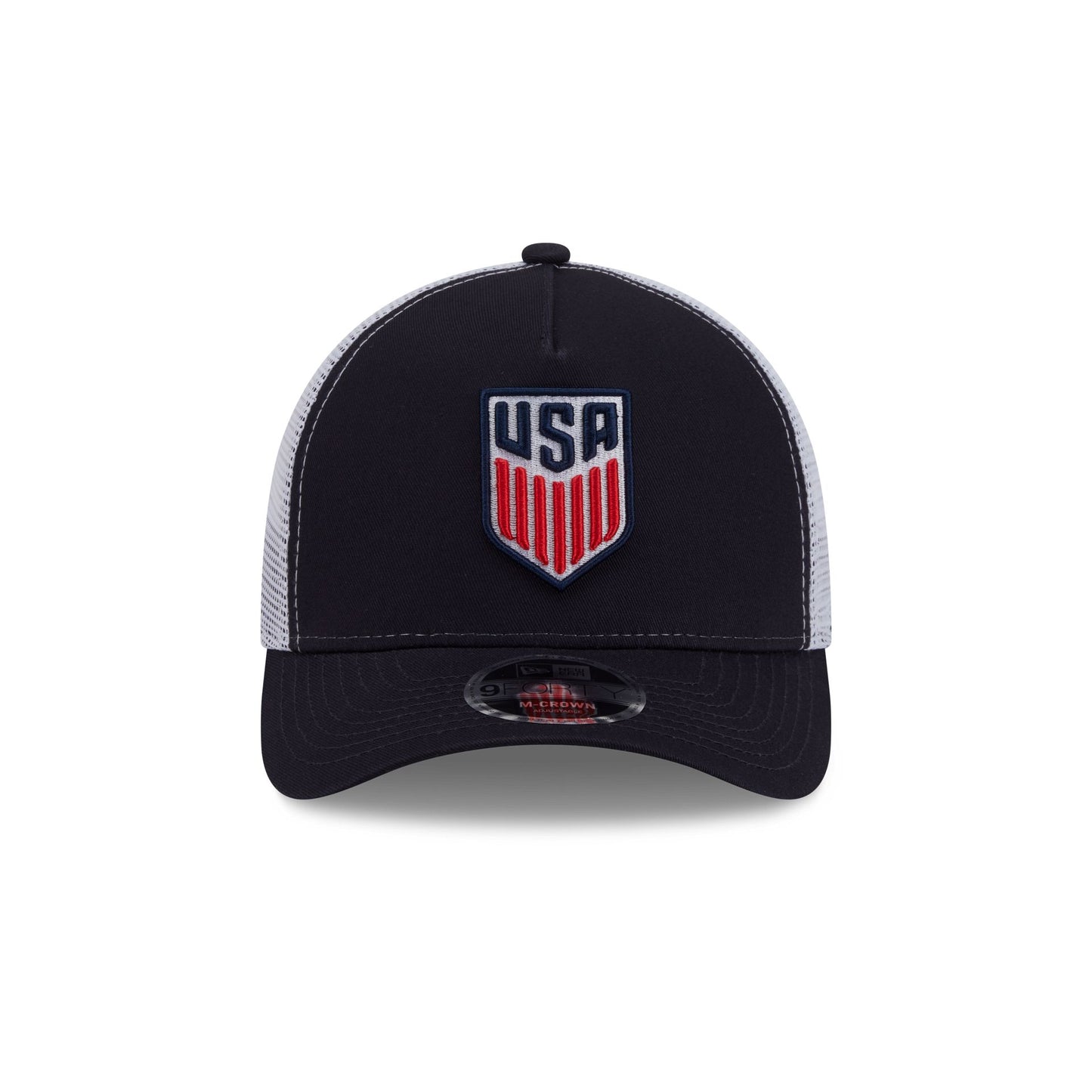 The U.S. Soccer Men's National Team Navy 9FORTY M-Crown A-Frame Trucker features an embroidered U.S. Soccer logo at the front panel with a matching woven team logo tag at a snapback closure at the rear.